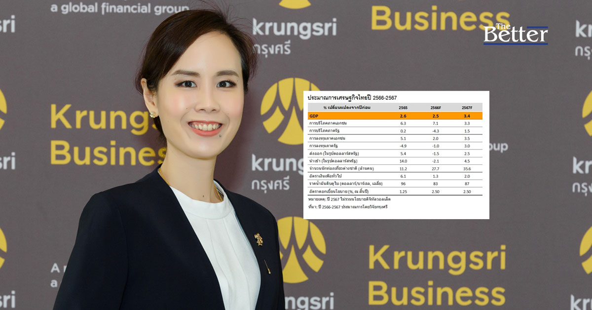 ดร.พิมพ์นารา หิรัญกสิ หัวหน้าทีมวิจัยเศรษฐกิจ ธนาคารกรุงศรีอยุธยา (จำกัด) มหาชน กล่าวว่า วิจัยกรุงศรีคาดการณ์ว่า เศรษฐกิจไทยในปี 2567 จะขยายตัวที่ 3.4% ซึ่งตัวเลขนี้ไม่นับรวมผลของนโยบายดิจิทัลวอลเล็ต โดยมีปัจจัยภายในประเทศเป็นแรงขับเคลื่อนที่สำคัญ ได้แก่ 1.การฟื้นตัวต่อเนื่องของภาคการท่องเที่ยว จากมาตรการสนับสนุนของภาครัฐและความสามารถในการรองรับนักท่องเที่ยวที่ปรับดีขึ้น โดยประมาณการว่าจำนวนนักท่องเที่ยวต่างชาติจะเพิ่มขึ้นจาก 27.7 ล้านคนในปี 2566 เป็น 35.6 ล้านคนในปี 2567 แม้จะยังไม่กลับสู่ระดับก่อนเกิดการระบาดของโควิดที่ 40 ล้านคนก็ตาม