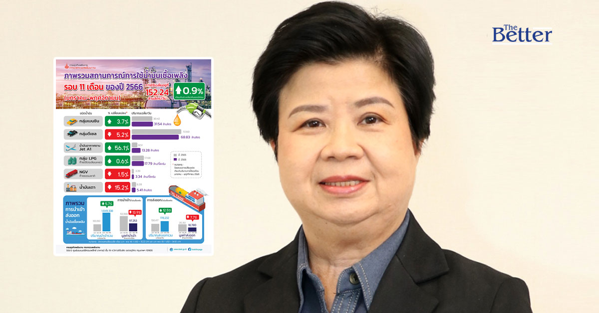 สำหรับการใช้น้ำมันกลุ่มเบนซิน เดือนมกราคม – พฤศจิกายน 2566 เฉลี่ยอยู่ที่ 31.54 ล้านลิตร/วัน เพิ่มขึ้น จากช่วงเดียวกันของปีก่อนร้อยละ 3.7 การใช้แก๊สโซฮอล์ 95 เพิ่มขึ้นมาอยู่ที่ 17.93 ล้านลิตร/วัน และแก๊สโซฮอล์ อี20 เพิ่มขึ้นมาอยู่ที่ 5.89 ล้านลิตร/วัน ส่วนการใช้แก๊สโซฮอล์ 91 แก๊สโซฮอล์ อี85 และเบนซิน ลดลงมาอยู่ที่ 6.78 ล้านลิตร/วัน 0.16 ล้านลิตร/วัน และ 0.46 ล้านลิตร/วัน ตามลำดับ
