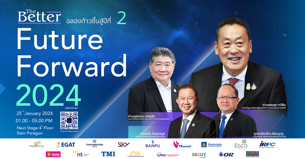 ขอเรียนเชิญแขกผู้มีเกียรติทุกท่านร่วมฉลองการก้าวขึ้นสู่ปีที่ 2 ของสำนักข่าว The Better ในงาน The Better Future Forward 2024 พบกับ ฯพณฯ เศรษฐา ทวีสิน นายกรัฐมนตรีและรัฐมนตรีว่าการกระทรวงการคลัง ปาฐกถาพิเศษหัวข้อ Reinventing Thailand : Toward Becoming a Key Global Player ทำประเทศไทยให้ดีกว่าเดิม : สู่พลังขับเคลื่อนหลักในเวทีโลก
