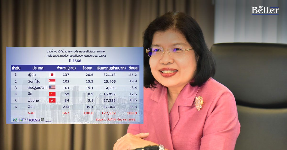 อย่างไรก็ตามเฉพาะเดือนธันวาคม 2566 มีการอนุญาตให้คนต่างชาติประกอบธุรกิจในประเทศไทย จำนวน 55 ราย เป็นการลงทุนผ่านช่องทางการขอรับใบอนุญาตประกอบธุรกิจของคนต่างด้าว จำนวน 19 ราย และการขอหนังสือรับรองการประกอบธุรกิจของคนต่างด้าว จำนวน 36 ราย เงินลงทุน 29,244 ล้านบาท ซึ่งส่วนใหญ่เป็นคนต่างชาติจากฮ่องกง ญี่ปุ่น และสิงคโปร์ มีการจ้างงานคนไทย 759 คน