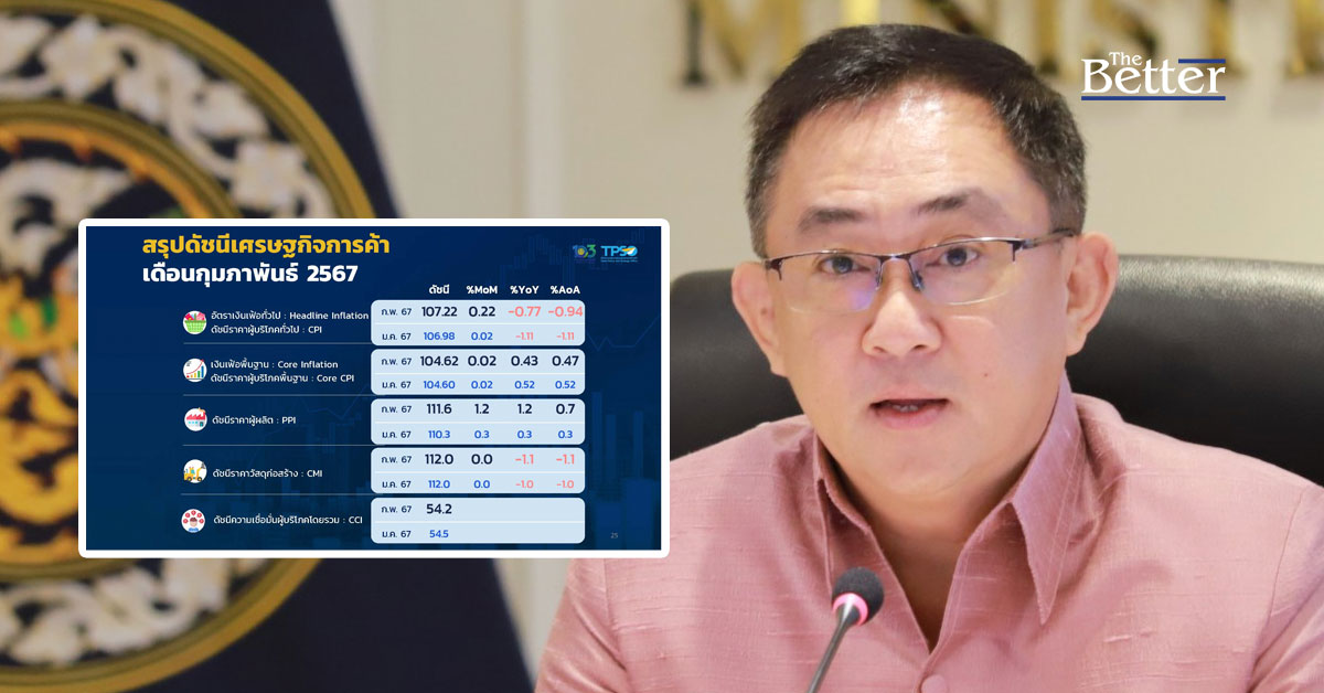 นายพูนพงษ์ นัยนาภากรณ์ ผู้อำนวยการสำนักงานนโยบายและยุทธศาสตร์การค้า เปิดเผยว่า ดัชนีราคาผู้บริโภคของไทย เดือนกุมภาพันธ์ 2567 เท่ากับ 107.22 เมื่อเทียบกับเดือนกุมภาพันธ์ 2566 ซึ่งเท่ากับ 108.05 ทำให้อัตราเงินเฟ้อทั่วไปลดลงร้อยละ 0.77 (YoY) ลดลงต่อเนื่องเป็นเดือนที่ 5 ส่งผลให้ดัชนีราคาผู้บริโภคทั่วไป 2 เดือนแรก (มกราคม – กุมภาพันธ์) ของปี 2567 เทียบกับช่วงเดียวกันของปี 2566 ลดลงร้อยละ 0.94 (AoA)
