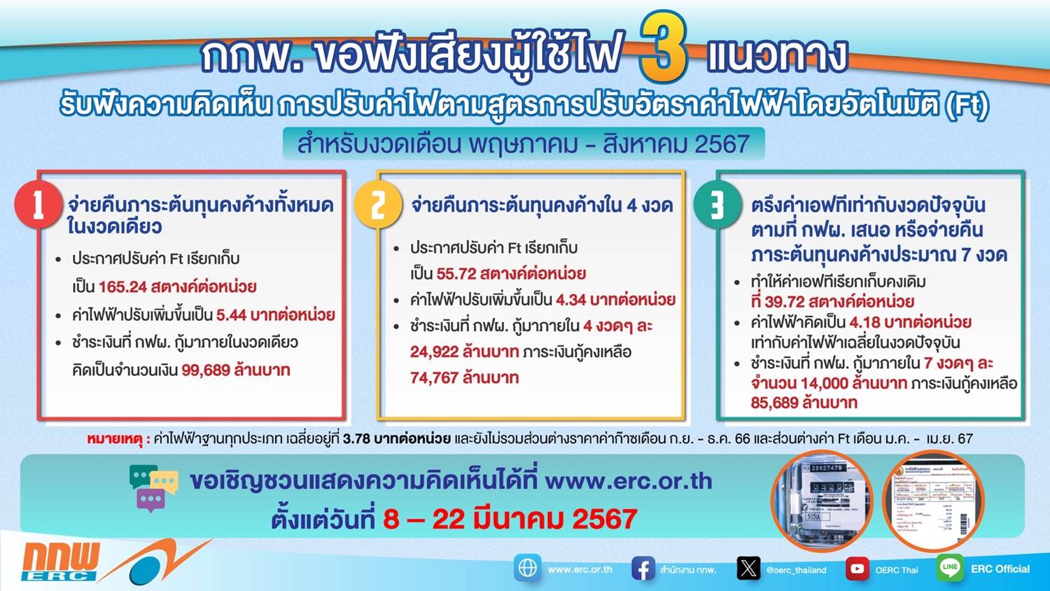 ทั้งนี้ กกพ. เปิดรับฟังความคิดเห็นผ่านทางเว็บไซต์สำนักงาน กกพ. ตั้งแต่วันที่ 8 – 22 มีนาคม 2567 ก่อนที่จะมีการสรุปและประกาศอย่างเป็นทางการต่อไป