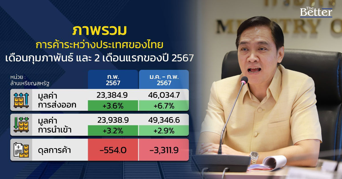นายกีรติ รัชโน ปลัดกระทรวงพาณิชย์ เปิดเผยถึงภาวะการค้าระหว่างประเทศของไทย ว่า การส่งออกของไทยในเดือนกุมภาพันธ์ 2567 มีมูลค่า 23,384.9 ล้านเหรียญสหรัฐ (827,139 ล้านบาท) ขยายตัวต่อเนื่องเป็นเดือนที่ 7 ที่ร้อยละ 3.6 หากหักสินค้าเกี่ยวเนื่องกับน้ำมัน ทองคำ และยุทธปัจจัย ขยายตัวร้อยละ 2.3 ส่งผลให้ ส่งออกไทย 2 เดือนแรก ขยายตัวร้อยละ 6.7 และเมื่อหักสินค้าเกี่ยวเนื่องกับน้ำมัน ทองคำ และยุทธปัจจัย ขยายตัวร้อยละ 5.6