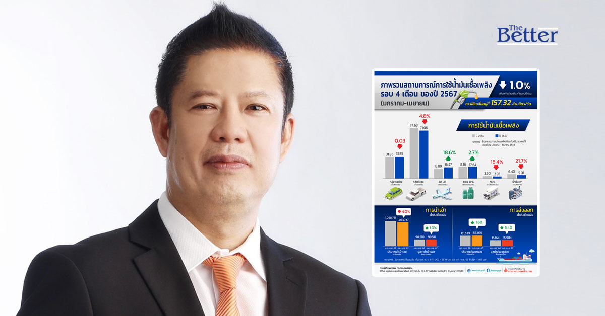 นายสราวุธ แก้วตาทิพย์ อธิบดีกรมธุรกิจพลังงาน เปิดเผยถึง ภาพรวมการใช้น้ำมันเชื้อเพลิงเฉลี่ย เดือนม.ค.-เม.ย. 2567 อยู่ที่ 157.32 ล้านลิตร/วัน ลดลงเมื่อเทียบกับช่วงเดียวกันของปีก่อน ร้อยละ 1.0 โดยน้ำมันเตามีการใช้ลดลงร้อยละ 21.7 NGV ลดลงร้อยละ 16.4 น้ำมัน กลุ่มดีเซลลดลงร้อยละ 4.8 และน้ำมันกลุ่มเบนซินลดลงร้อยละ 0.03 ขณะที่การใช้น้ำมันอากาศยานเชิงพาณิชย์ (Jet A1) เพิ่มขึ้นร้อยละ 18.6 และ LPG เพิ่มขึ้นร้อยละ 2.7