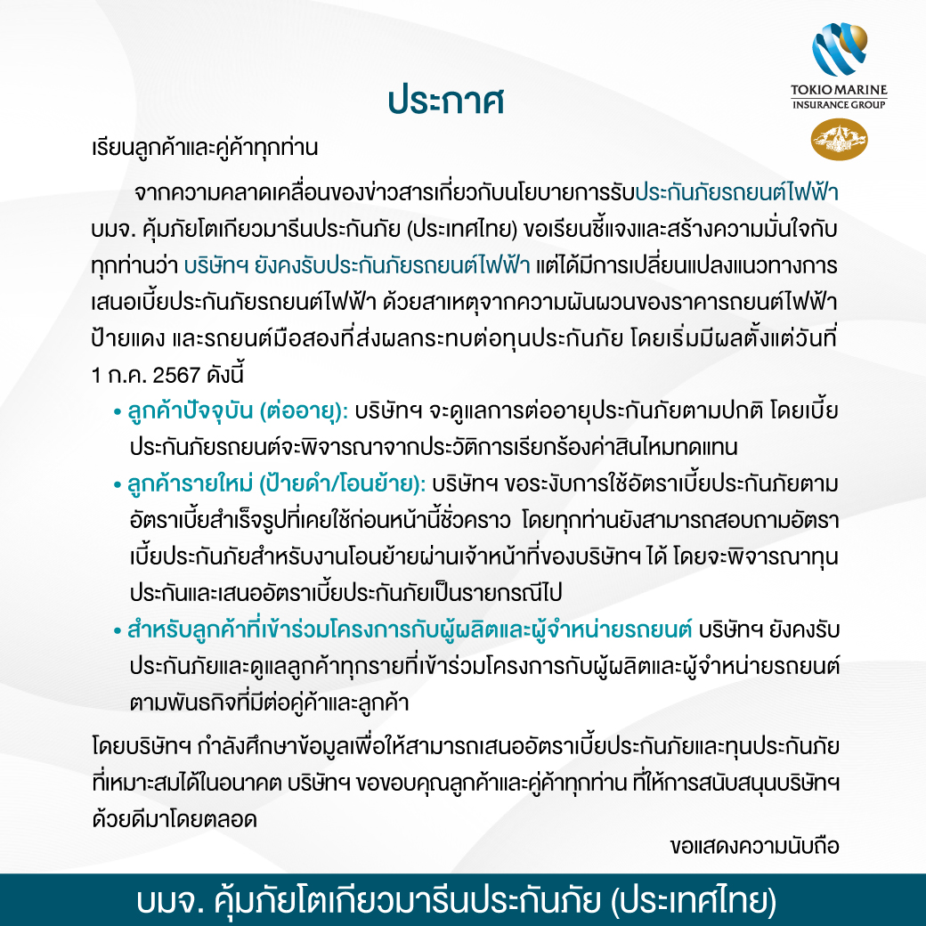 “เรายังคงให้บริการประกันภัยรถยนต์ไฟฟ้าอย่างต่อเนื่อง แต่มีการปรับเปลี่ยนแนวทางการเสนอเบี้ยเบี้ยและทุนประกันให้เหมาะสมยิ่งขึ้น เนื่องจากความผันผวนของราคารถยนต์ไฟฟ้า โดยมีผลตั้งแต่ 1 ก.ค. 2567” บริษัท คุ้มภัยโตเกียวมารีนประกันภัย แจง