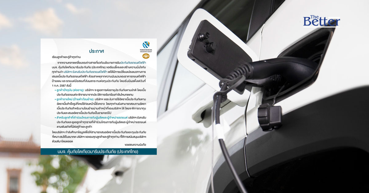 คุ้มภัยโตเกียวมารีนประกันภัย แจง ยังรับประกันรถ EV ทั้งลูกค้าใหม่-ลูกเดิม แต่มีการปรับเปลี่ยนแนวทางการเสนอเบี้ยเบี้ยและทุนประกันให้เหมาะสมยิ่งขึ้น