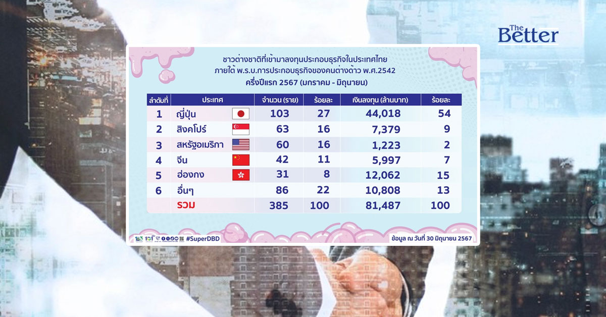 นางอรมน ทรัพย์ทวีธรรม อธิบดีกรมพัฒนาธุรกิจการค้า ในฐานะเลขานุการคณะกรรมการการประกอบธุรกิจของคนต่างด้าว พ.ศ.2542 เปิดเผยว่า ครึ่งปีแรกของปี 2567 (มกราคม-มิถุนายน) มีการอนุญาตให้คนต่างชาติเข้ามาลงทุนประกอบธุรกิจในประเทศไทย ภายใต้พระราชบัญญัติการประกอบธุรกิจของคนต่างด้าว พ.ศ.2542 จำนวน 385 ราย โดยเป็นการลงทุนผ่านช่องทางการขอรับใบอนุญาตประกอบธุรกิจของคนต่างด้าว จำนวน 106 ราย และการขอหนังสือรับรองการประกอบธุรกิจของคนต่างด้าว (ผ่านช่องทางการลงทุนตามกฎหมายว่าด้วยการส่งเสริมการลงทุน หรือได้รับอนุญาตตามกฎหมายว่าด้วยการนิคมอุตสาหกรรมแห่งประเทศไทย และการใช้สิทธิตามสนธิสัญญาหรือความตกลงระหว่างประเทศ) จำนวน 279 ราย เงินลงทุนรวมทั้งสิ้น 81,487 ล้านบาท จ้างงานคนไทย 1,852 คน