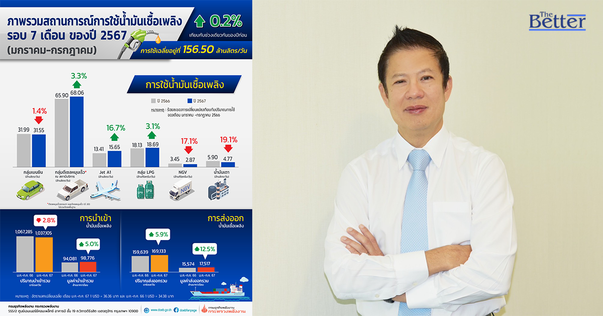 นายสราวุธ แก้วตาทิพย์ อธิบดีกรมธุรกิจพลังงาน เผยภาพรวมการใช้น้ำมันเชื้อเพลิงรอบ 7 เดือน เฉลี่ยเดือนมกราคม–กรกฎาคม 2567 อยู่ที่ 156.50 ล้านลิตร/วัน เพิ่มขึ้นเมื่อเทียบกับช่วงเดียวกันของปีก่อน ร้อยละ 0.2 โดยกลุ่มเบนซินลดลงร้อยละ 1.4 ซึ่งมีปัจจัยสำคัญจากระดับราคาขายปลีกที่อยู่ในระดับสูงกว่าปีก่อน การพัฒนาโครงข่ายระบบรถไฟฟ้าขนส่งมวลชนในเขตเมืองและโครงการรถไฟทางคู่ที่เชื่อมต่อระหว่างจังหวัด รวมถึงจำนวนยานยนต์ไฟฟ้าที่ขยายตัวอย่างต่อเนื่อง สำหรับดีเซลหมุนเร็ว ณ สถานีบริการเพิ่มขึ้นร้อยละ 3.3 ขยายตัวตามการฟื้นตัวของเศรษฐกิจโดยเฉพาะในภาคการท่องเที่ยวและภาคบริการ สอดคล้องกับการผลิตภาคอุตสาหกรรมโดยรวมปรับตัวดีขึ้น สะท้อนจากข้อมูลจำนวนโรงงานที่แจ้งเปิดกิจการใหม่และมูลค่าเงินลงทุนเพิ่มขึ้นจากช่วงเวลาเดียวกันของปีก่อน1 น้ำมันอากาศยานเชิงพาณิชย์ (Jet A1) เพิ่มขึ้นร้อยละ 16.7 ขยายตัวจากมาตรการส่งเสริมการท่องเที่ยวของรัฐบาล ขณะที่น้ำมันเตาลดลง ร้อยละ 19.1 NGV ลดลงร้อยละ 17.1 ซึ่งมีแนวโน้มลดลงอย่างต่อเนื่อง และการใช้ LPG เพิ่มขึ้นร้อยละ 3.1