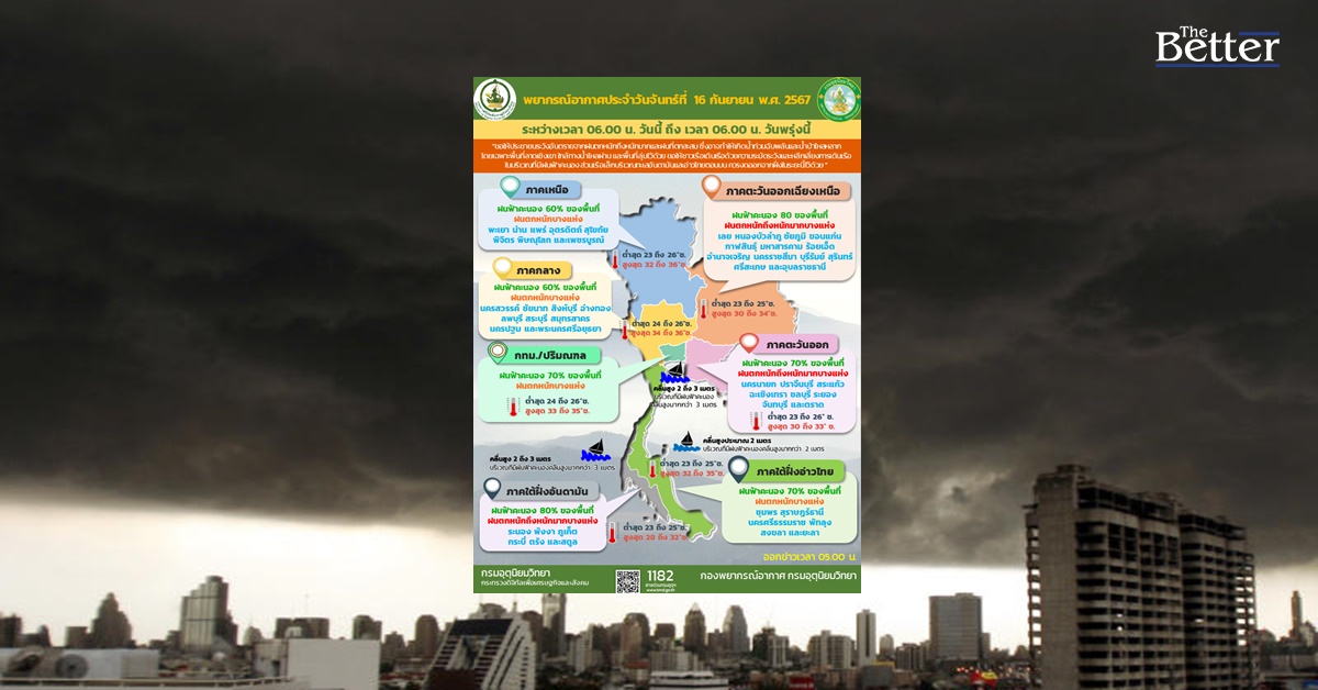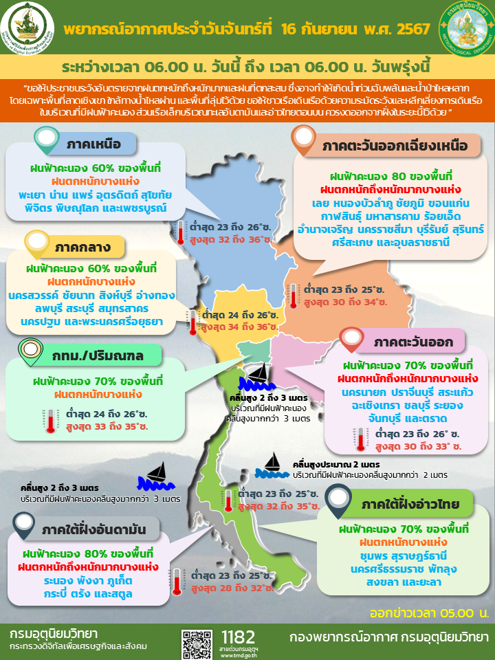 กรมอุตุนิยมวิทยา รายงาน ลักษณะอากาศทั่วไป ประจำวันที่ 16 กันยายน 2567 พยากรณ์อากาศ 24 ชั่วโมงข้างหน้า ประเทศไทยมีฝนตกหนักบางแห่ง โดยมีฝนตกหนักมากบางพื้นที่ ในภาคตะวันออกเฉียงเหนือ ภาคตะวันออก และภาคใต้ฝั่งตะวันตก ขอให้ประชาชนในบริเวณดังกล่าวระวังอันตรายจากฝนตกหนักถึงหนักมากและฝนที่ตกสะสม ซึ่งอาจทำให้เกิดน้ำท่วมฉับพลันและน้ำป่าไหลหลาก โดยเฉพาะพื้นที่ลาดเชิงเขา ใกล้ทางน้ำไหลผ่าน และพื้นที่ลุ่มไว้ด้วย ทั้งนี้เนื่องจากร่องมรสุมเลื่อนลงมาพาดผ่านภาคเหนือ และภาคตะวันออกเฉียงเหนือ เข้าสู่หย่อมความกดอากาศต่ำบริเวณชายฝั่งประเทศเวียดนามตอนกลาง ประกอบกับมรสุมตะวันตกเฉียงใต้กำลังค่อนข้างแรงพัดปกคลุมทะเลอันดามัน ประเทศไทย และอ่าวไทย