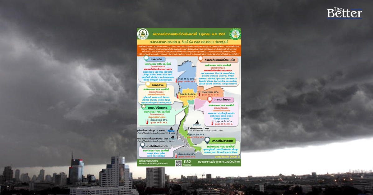 ในช่วงวันที่ 1 ต.ค. - 3 ต.ค. 67 บริเวณความกดอากาศสูงหรือมวลอากาศเย็นกำลังปานกลางจากประเทศจีน จะแผ่ลงมาปกคลุมภาคเหนือด้านตะวันออก ภาคตะวันออกเฉียงเหนือของประเทศไทย และทะเลจีนใต้ ประกอบกับร่องมรสุม จะพาดผ่านภาคเหนือ ภาคตะวันออกเฉียงเหนือตอนล่าง ภาคกลาง และภาคตะวันออก ลักษณะเช่นนี้จะทำให้ประเทศไทยตอนบนมีลักษณะอากาศแปรปรวนเกิดขึ้น โดยมีฝนฟ้าคะนอง ลมกระโชกแรง ฝนตกหนักบางแห่งใน ภาคกลาง รวมทั้งกรุงเทพมหานครและปริมณฑล ภาคตะวันออก และมีฝนตกหนักมากบางพื้นที่ในภาคเหนือ และภาคตะวันออกเฉียงเหนือ หลังจากนั้นอากาศจะเย็นลง กับมีลมแรง และอุณหภูมิจะลดลง 1 – 3 องศาเซลเซียสในภาคตะวันออกเฉียงเหนือขอให้ประชาชนบริเวณประเทศไทยตอนบน ระมัดระวังอันตรายจากฝนฟ้าคะนอง ลมกระโชกแรง ฝนตกหนักถึงหนักมากและฝนที่ตกสะสมซึ่งอาจทำให้เกิดน้ำท่วมฉับพลันและน้ำป่าไหลหลาก โดยเฉพาะพื้นที่ลาดเชิงเขาใกล้ทางน้ำไหลผ่านและพื้นที่ลุ่ม หลีกเลี่ยงการอยู่ในที่โล่งแจ้ง ใต้ต้นไม้ใหญ่ และป้ายโฆษณาที่ไม่แข็งแรง รวมถึงดูแลรักษาสุขภาพเนื่องจากสภาวะอากาศที่เปลี่ยนแปลงไว้ด้วย