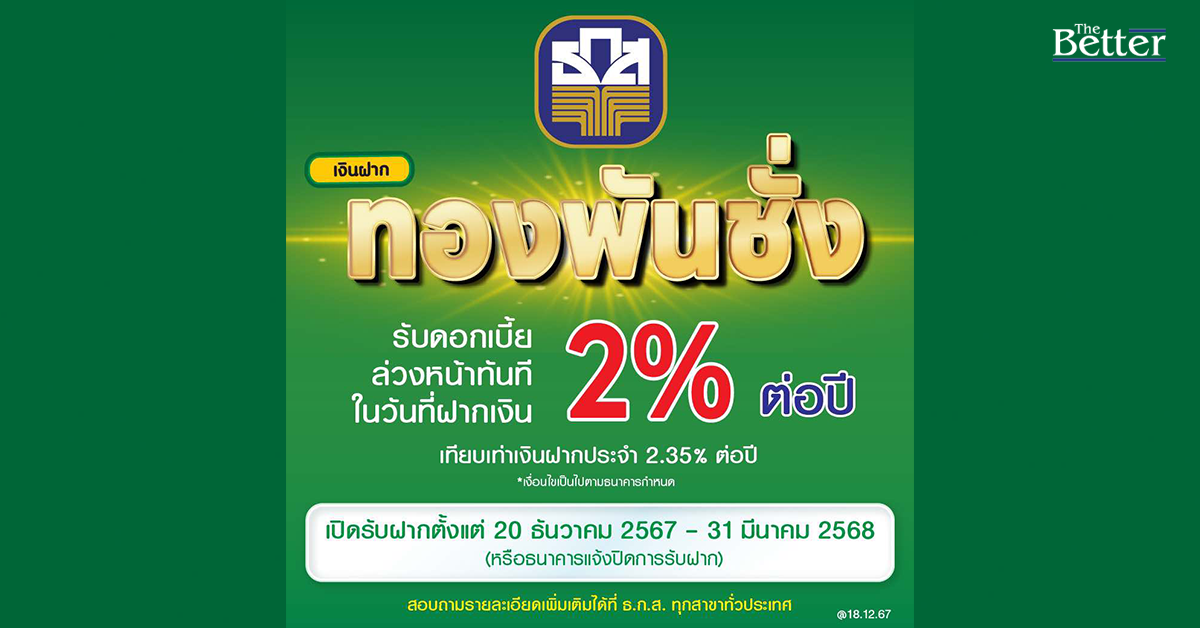 ธ.ก.ส. เปิดตัวเงินฝากออมทรัพย์พิเศษ “เงินฝากทองพันชั่ง” รับดอกเบี้ยล่วงหน้าเข้าบัญชีทันทีในวันที่เริ่มฝากเงินในบัญชี แต่วันที่ 20 ธันวาคม 2567 – 31 มีนาคม 2568