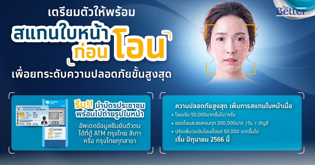 ทั้งนี้ การยืนยันตัวตนด้วยใบหน้าก่อนโอนเงิน เริ่มในเดือนมิถุนายน 2566 สำหรับลูกค้าที่ยังไม่เคยมีข้อมูลการยืนยันตัวตนด้วยใบหน้า หรือ ข้อมูลไม่อัพเดต สามารถเพิ่มข้อมูลได้ เพียงนำบัตรประชาชนไปขอดำเนินการผ่านธนาคารกรุงไทยทุกสาขา และ ตู้ ATM ที่มีสัญลักษณ์ Confirm ID (ตู้สีเทา) โดยอัพเดตข้อมูล ครั้งเดียวใช้ได้ทั้ง แอปฯ Krungthai NEXT และเป๋าตัง