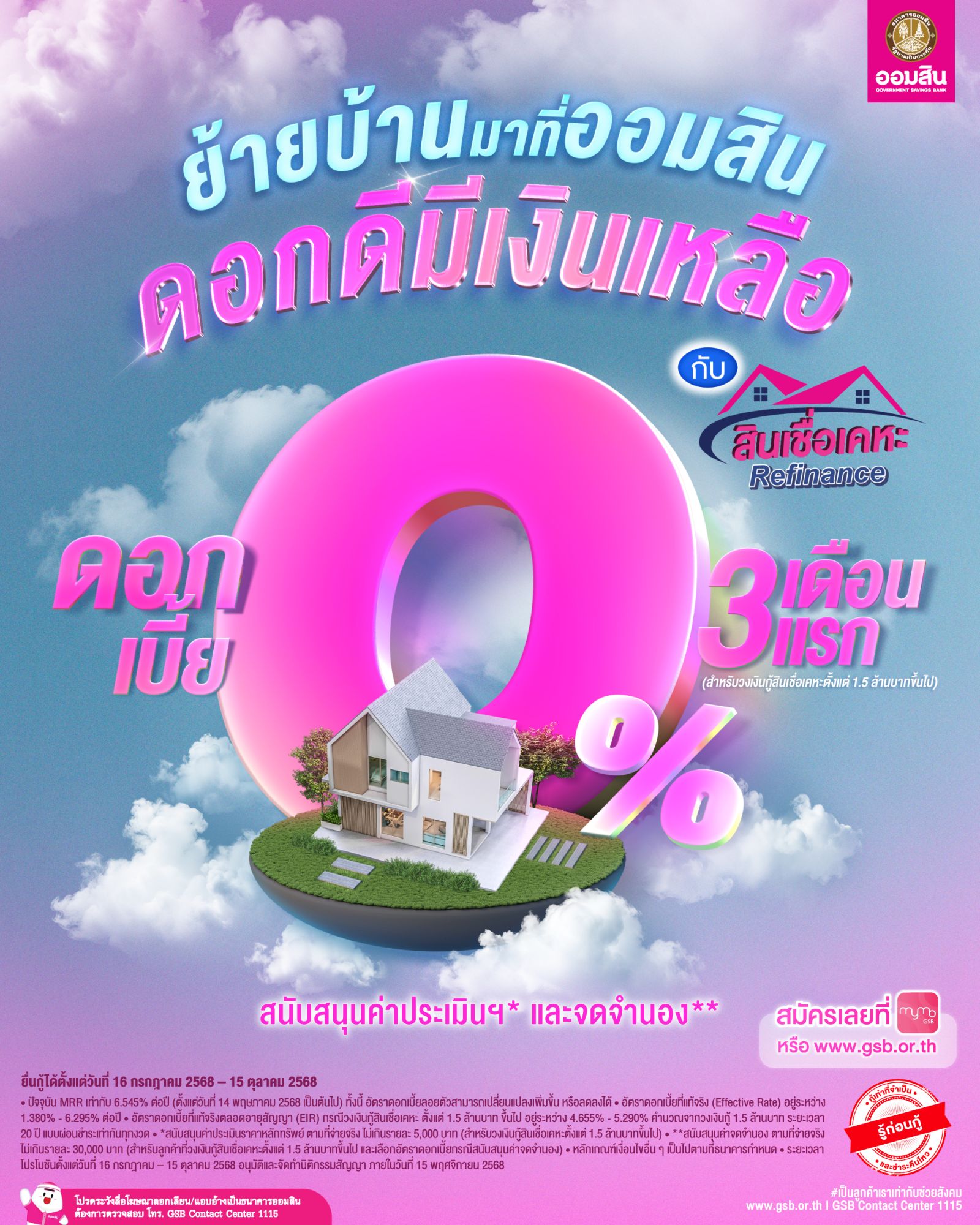 เพื่อ “บ้าน”จุดเริ่มต้นของความสุข ธนาคารออมสิน (GSB) เปิดโปร “สินเชื่อเคหะ Refinance” ชูอัตราดอกเบี้ย 0% ช่วง 3 เดือนแรก และดอกเบี้ยคงที่เฉลี่ย 3 ปี เริ่มต้น 2.85% ช่วยลดภาระดอกเบี้ย
