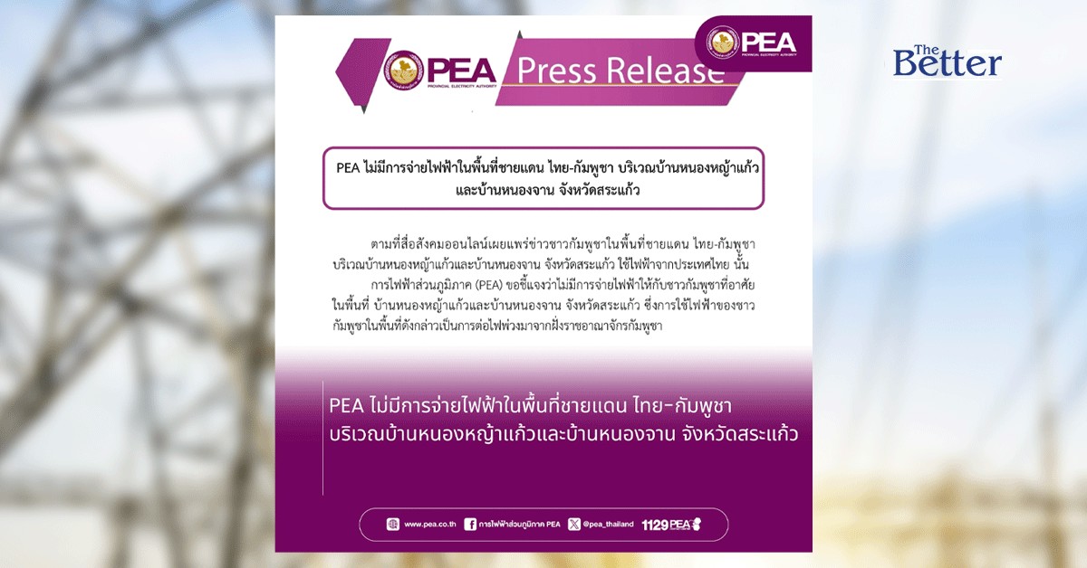 PEA โต้ข่าวเฟคนิวส์โซเชียลแจงไม่เคยจ่ายไฟฟ้าในพื้นที่ชายแดน ไทย-กัมพูชา บริเวณบ้านหนองหญ้าแก้วและบ้านหนองจาน จังหวัดสระแก้ว ชี้เป็นการต่อพ่วงไฟจากฝั่งกัมพูชาเอง