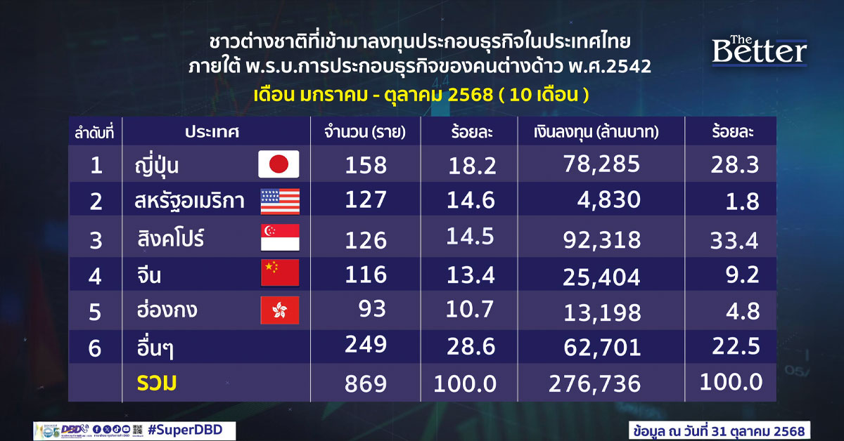 อย่างไรก็ตามเฉพาะเดือนตุลาคม 2568 มีการอนุญาตให้คนต่างชาติเข้ามาประกอบธุรกิจในประเทศไทย 99 ราย เป็นการลงทุนผ่านช่องทางการขอรับใบอนุญาตประกอบธุรกิจของคนต่างด้าว 27 ราย และการขอหนังสือรับรองการประกอบธุรกิจของคนต่างด้าว (ผ่านช่องทางการลงทุนตามกฎหมายว่าด้วยการส่งเสริมการลงทุน หรือได้รับอนุญาตตามกฎหมายว่าด้วยการนิคมอุตสาหกรรมแห่งประเทศไทย และการใช้สิทธิตามสนธิสัญญาหรือความตกลงระหว่างประเทศ) 72 ราย เงินลงทุนรวมทั้งสิ้น 23,621 ล้านบาท