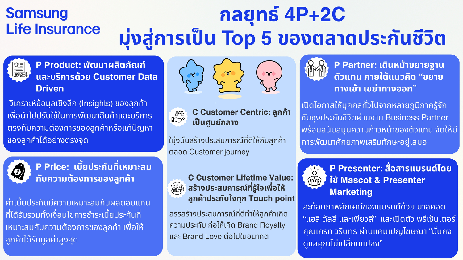 ซัมซุงประกันชีวิตเดินหน้าสู่ปีที่ 29 ด้วยกลยุทธ์ 4P+2C ครอบคลุมผลิตภัณฑ์ ราคา พันธมิตร พรีเซ็นเตอร์ และการยึดลูกค้าเป็นศูนย์กลางตั้งเป้าขยายฐานลูกค้ายกระดับบริการและเร่งยอดขายพร้อมรับเทศกาลลดหย่อนภาษี