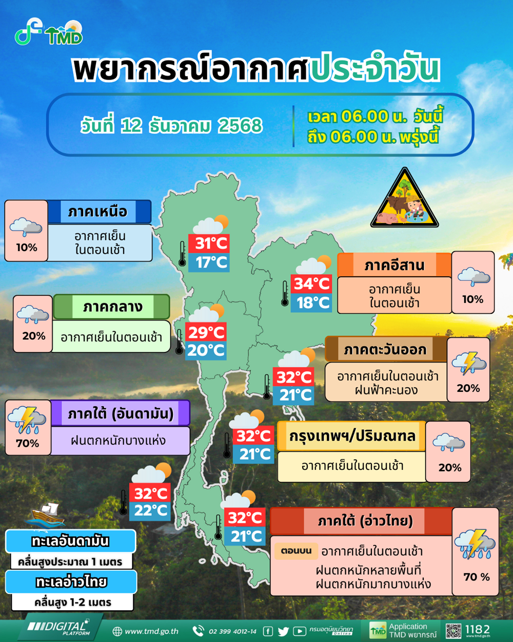 อนึ่ง ประเทศไทยตอนบนจะมีอากาศแปรปรวน มีฝนฟ้าคะนองเกิดขึ้นบางแห่งในช่วงวันที่ 12-13 ธ.ค. 68เนื่องจากมีลมตะวันออกพัดนำความชื้นเข้ามาปกคลุมประเทศไทยตอนบน จากนั้นอุณหภูมิจะลดลง 2-4 องศาเซลเซียส โดยมีอากาศเย็นถึงหนาวกับมีลมแรง ทั้งนี้เนื่องจากบริเวณความกดอากาศสูงหรือมวลอากาศเย็นกำลังค่อนข้างแรงจากประเทศจีนจะแผ่ปกคลุมประเทศไทย ขอให้ประชาชนดูแลรักษาสุขภาพเนื่องจากสภาพอากาศที่เปลี่ยนแปลง เกษตรกรควรเตรียมการป้องกันและระวังความเสียหายที่จะเกิดต่อผลผลิตทางการเกษตร