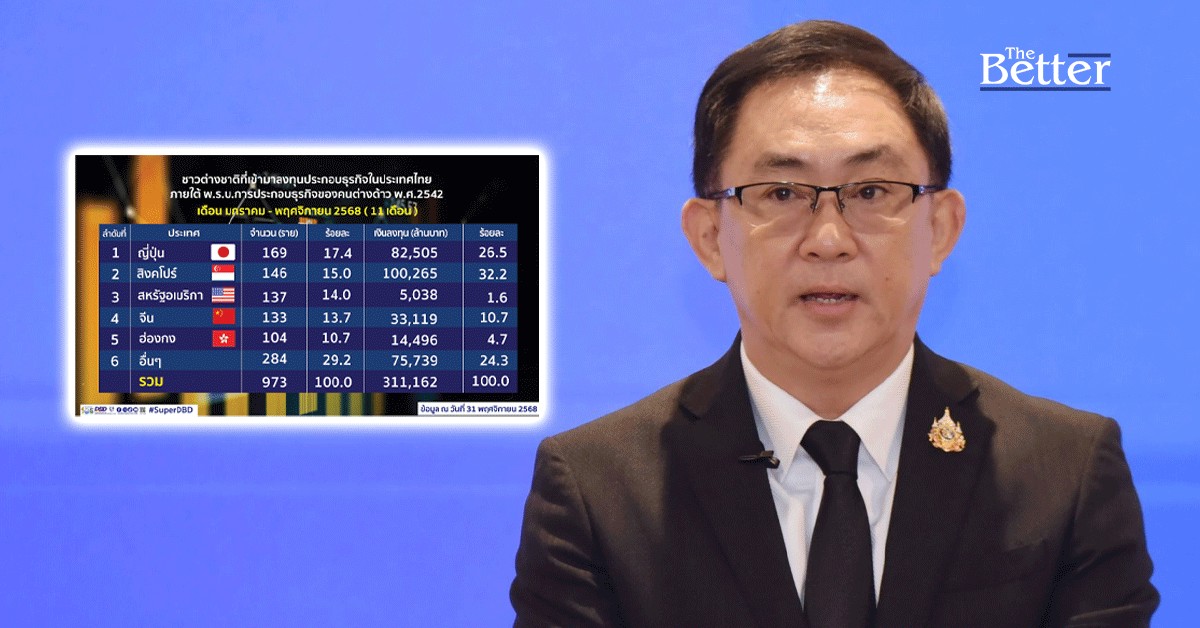 นายพูนพงษ์ นัยนาภากรณ์ อธิบดีกรมพัฒนาธุรกิจการค้า กระทรวงพาณิชย์ ในฐานะเลขานุการคณะกรรมการการประกอบธุรกิจของคนต่างด้าว เปิดเผยว่า ช่วง 11 เดือนของปี 2568 (มกราคม - พฤศจิกายน) มีการอนุญาตให้คนต่างชาติเข้ามาลงทุนประกอบธุรกิจในประเทศไทย ภายใต้พระราชบัญญัติการประกอบธุรกิจของคนต่างด้าว พ.ศ. 2542 จำนวน 973 ราย โดยเป็นการลงทุนผ่านช่องทางการขอรับใบอนุญาตประกอบธุรกิจของคนต่างด้าว 263 ราย และการขอหนังสือรับรองการประกอบธุรกิจของคนต่างด้าว (ผ่านช่องทางการลงทุนตามกฎหมายว่าด้วยการส่งเสริมการลงทุน หรือได้รับอนุญาตตามกฎหมายว่าด้วยการนิคมอุตสาหกรรมแห่งประเทศไทย และการใช้สิทธิตามสนธิสัญญาหรือความตกลงระหว่างประเทศ) 710 ราย มูลค่าเงินลงทุนรวมทั้งสิ้น 311,162 ล้านบาท
