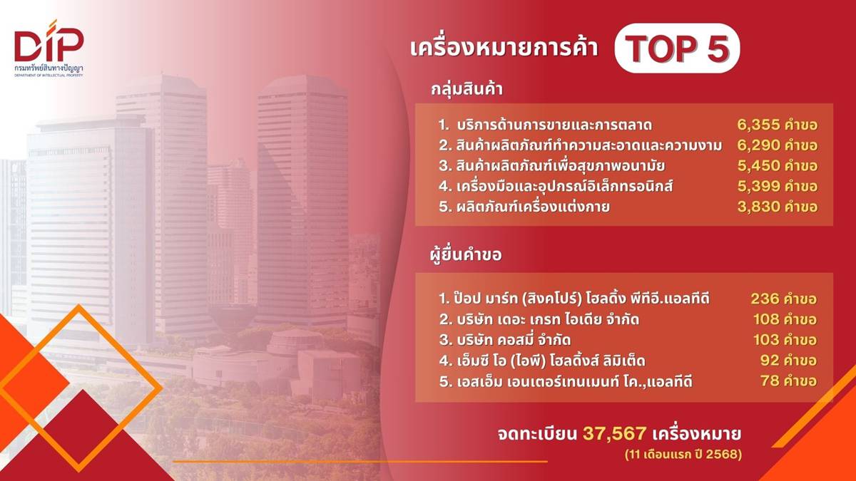 ทั้งนี้ตัวเลขการจดทะเบียนเครื่องหมายการค้า ในช่วง 11 เดือนแรกของปี 2568 อยู่ที่ 37,567 เครื่องหมาย เพิ่มขึ้น 41.52% เมื่อเทียบกับช่วงเวลาเดียวกันในปี 2567 (26,545 เครื่องหมาย)