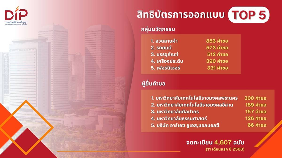 สำหรับผู้ยื่นคำขอมากที่สุด 5 อันดับแรก ได้แก่ มหาวิทยาลัยเทคโนโลยีราชมงคลพระนคร (300 คำขอ) มหาวิทยาลัยเทคโนโลยีราชมงคลอีสาน (189 คำขอ) มหาวิทยาลัยศิลปากร (157 คำขอ) มหาวิทยาลัยธรรมศาสตร์ (126 คำขอ) และบริษัท อาร์เอช ยูเอส, แอลแอลซี(66 คำขอ) ทั้งนี้ ตัวเลขการจดทะเบียนสิทธิบัตรการออกแบบผลิตภัณฑ์ ในช่วง 11 เดือนแรกของปี 2568 อยู่ที่4,607 ฉบับ.jpg)