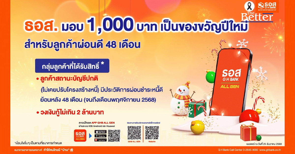 ธอส.ตอบแทนลูกค้าสถานะบัญชีปกติที่มีวงเงินกู้ไม่เกิน 2 ล้านบาท และมีประวัติการผ่อนชำระเงินงวดสินเชื่อบ้านย้อนหลังรวม 48 เดือนอย่างสม่ำเสมอ รับเงิน 1,000 บาท เป็นของขวัญปีใหม่ 2569