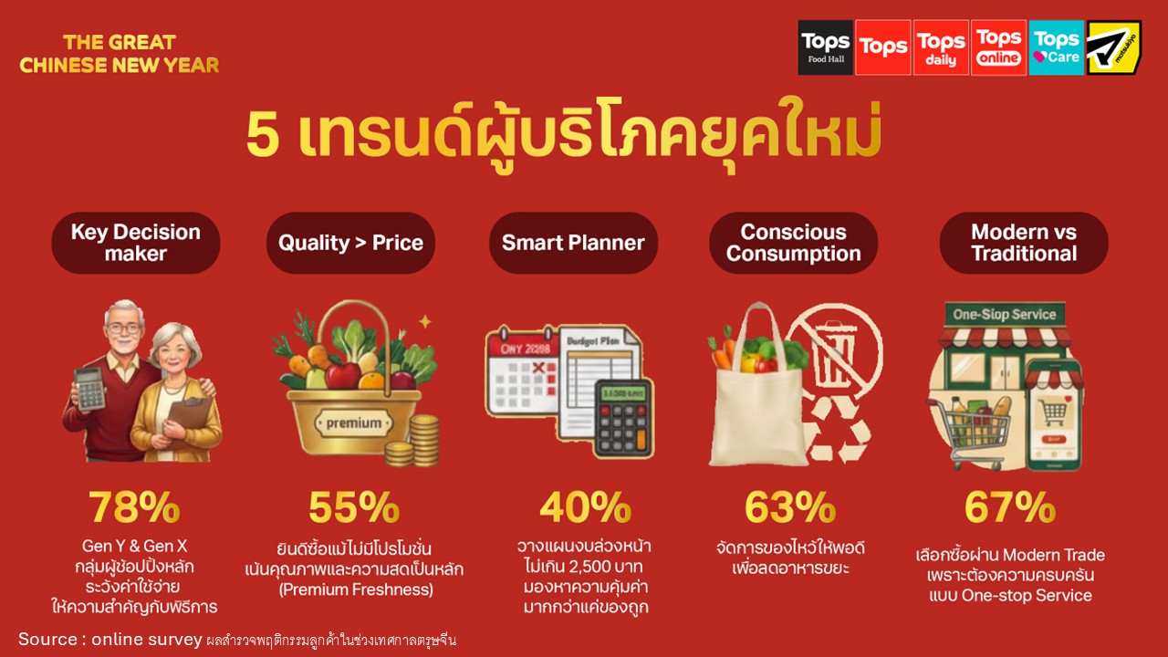 ท็อปส์ เปิดผลสำรวจพฤติกรรมผู้บริโภคช่วงตรุษจีนปี 2569 เผย 5 เทรนด์สำคัญ ชี้คนไทยหันมา “ซื้อสินค้าแบบฉลาดเลือก” ให้ความสำคัญกับคุณภาพและความเป็นสิริมงคลมากกว่าโปรโมชันตั้งเป้าดันยอดขายเติบโตมากกว่า 20%