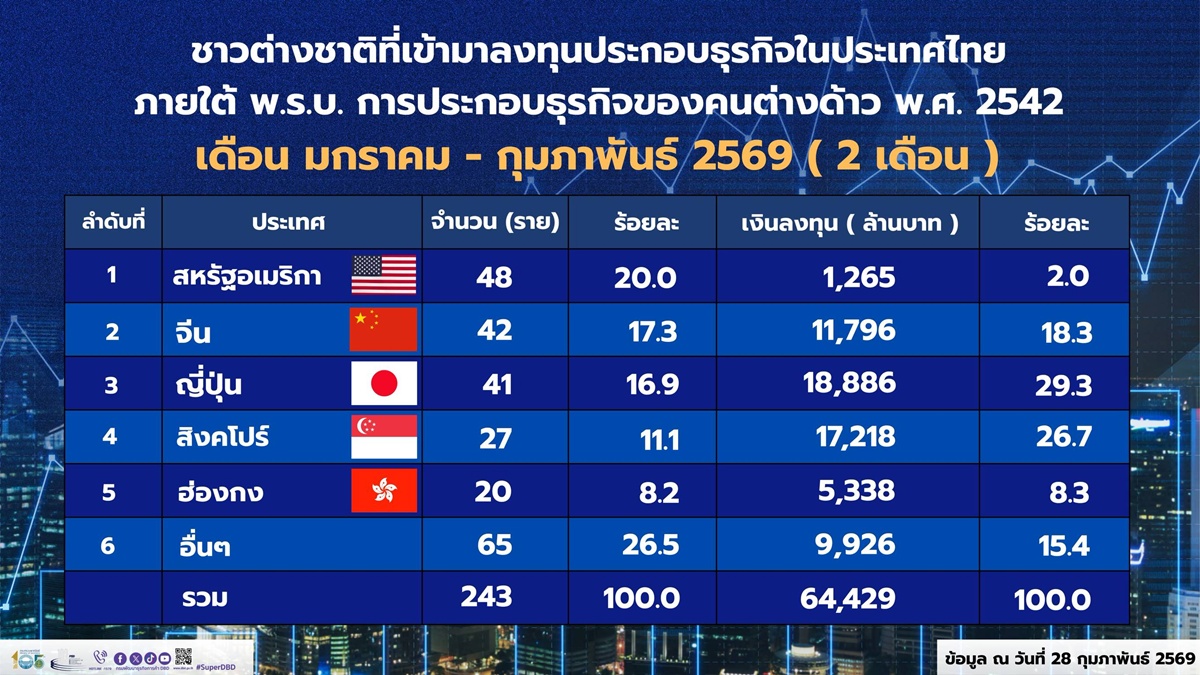 นายพูนพงษ์ นัยนาภากรณ์ อธิบดีกรมพัฒนาธุรกิจการค้า ในฐานะเลขานุการคณะกรรมการการประกอบธุรกิจของคนต่างด้าว เปิดเผยว่า การลงทุนช่วงสองเดือนแรกปี 2569 มีการอนุญาตให้คนต่างชาติเข้ามาลงทุนประกอบธุรกิจในประเทศไทย ภายใต้พระราชบัญญัติการประกอบธุรกิจของคนต่างด้าว พ.ศ. 2542 จำนวน 243 ราย โดยเป็นการลงทุนผ่านช่องทางการขอรับใบอนุญาตประกอบธุรกิจของคนต่างด้าว 47 ราย และการขอหนังสือรับรองการประกอบธุรกิจของคนต่างด้าว (ผ่านช่องทางการลงทุนตามกฎหมายว่าด้วยการส่งเสริมการลงทุน หรือได้รับอนุญาตตามกฎหมายว่าด้วยการนิคมอุตสาหกรรมแห่งประเทศไทย และการใช้สิทธิตามสนธิสัญญาหรือความตกลงระหว่างประเทศ) 196 ราย มูลค่าเงินลงทุนรวมทั้งสิ้น 64,429 ล้านบาท