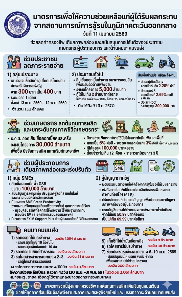 1.มาตรการบรรเทาผลกระทบสำหรับประชาชน มุ่งเน้นการช่วยเหลือค่าครองชีพเร่งด่วนและสนับสนุนการเปลี่ยนผ่านสู่พลังงานสะอาด ได้แก่การ ช่วยเหลือกลุ่มเปราะบาง ผู้ถือบัตรสวัสดิการแห่งรัฐ จำนวน 13.22 ล้านคน โดยขยายวงเงินค่าซื้อสินค้าอุปโภคบริโภคจาก 300 บาท เป็น 400 เป็นระยะเวลา 1 เดือน (13 เม.ย. – 12 พ.ค. 2569)