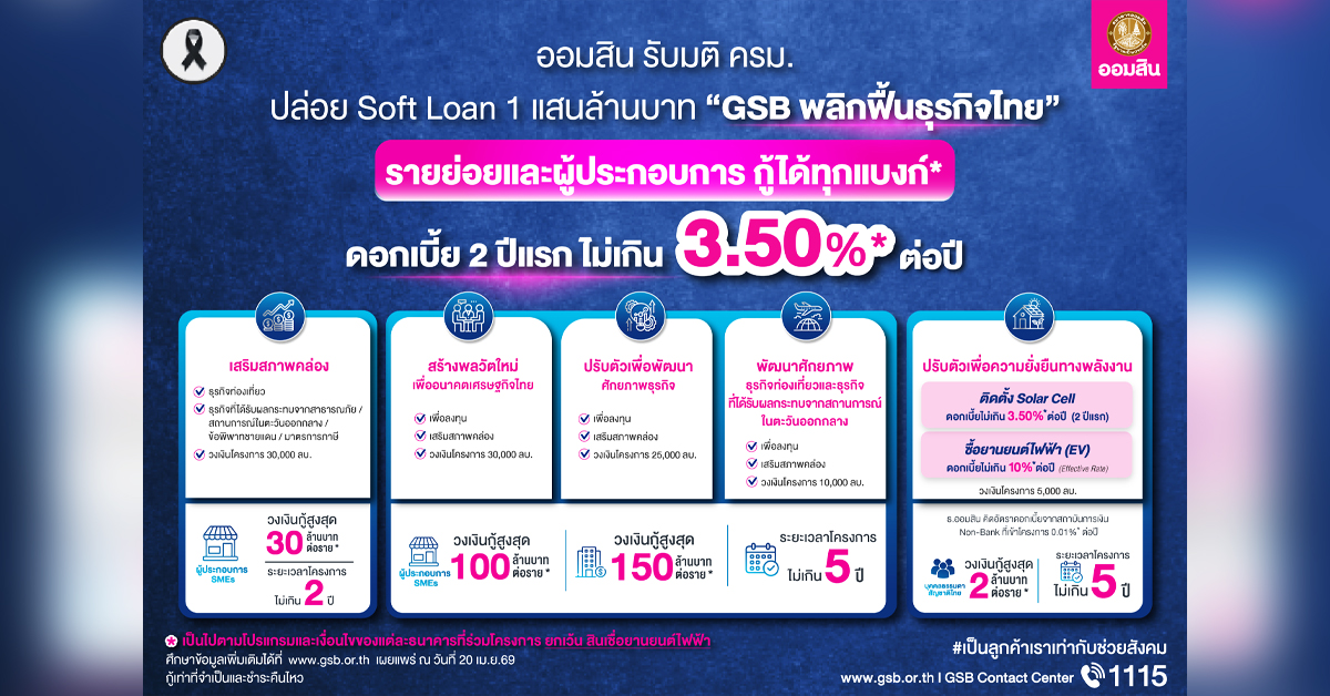 นายทรงพล ชีวะปัญญาโรจน์ ผู้อำนวยการธนาคารออมสิน เปิดเผยว่า ตามมติคณะรัฐมนตรี เมื่อวันที่ 11 เมษายน 2569 เห็นชอบการออกมาตรการดูแลผู้ที่ได้รับผลกระทบจากสถานการณ์วิกฤตพลังงาน ความไม่แน่นอนทางเศรษฐกิจและความขัดแย้งในต่างประเทศ โดยมอบหมายให้ธนาคารออมสินเป็นแกนหลักในการขับเคลื่อนมาตรการทางการเงินเพื่อเติมสภาพคล่องผ่าน โครงการสินเชื่อดอกเบี้ยต่ำ (Soft Loan) “GSB พลิกฟื้นธุรกิจไทย” วงเงิน 100,000 ล้านบาท มุ่งช่วยประชาชนและผู้ประกอบการ SMEs ปรับตัวรับมือวิกฤตที่ส่งผลกระทบต่อการดำรงชีวิตและการดำเนินธุรกิจ พร้อมสนับสนุนการเปลี่ยนผ่านสู่การใช้พลังงานทางเลือก โดยความร่วมมือของธนาคารพาณิชย์และสถาบันการเงินเฉพาะกิจทั้ง 16 แห่ง ในการส่งผ่านเงินทุนดอกเบี้ยต่ำไปยังกลุ่มเป้าหมายให้เร็วที่สุด
