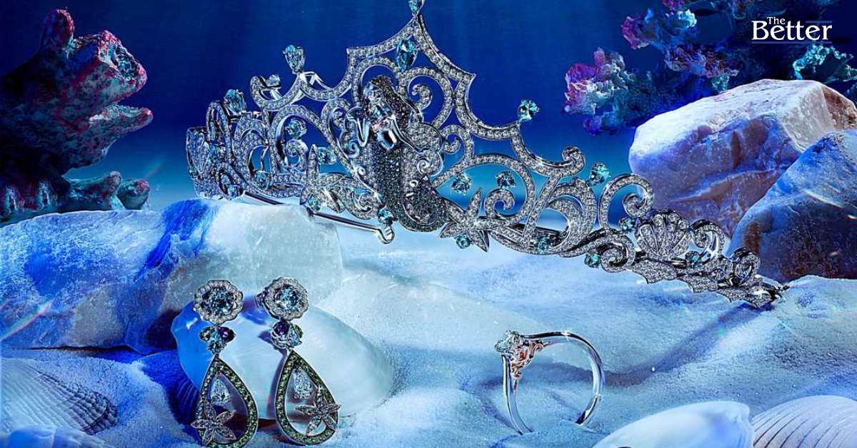 โดยมงกุฎ The Little Mermaid Tiara คอลเลกชันพิเศษนี้ประกอบด้วย ตัวเรือนทองขาว 18K ล้อมด้วยเพชร 1,000 เม็ด น้ำหนักกว่า 11 กะรัต พร้อมอัญมณีหายากกว่า 187 เม็ด ไม่ว่าจะเป็นอความารีนที่เปรียบเสมือนสีของท้องทะเล ไวโอเล็ต แซฟไฟร์ และกรีน ทัวร์มาลีน น้ำหนักรวม 7 กะรัต ที่มีขั้นตอนการผลิตมากกว่า 480 ชั่วโมง