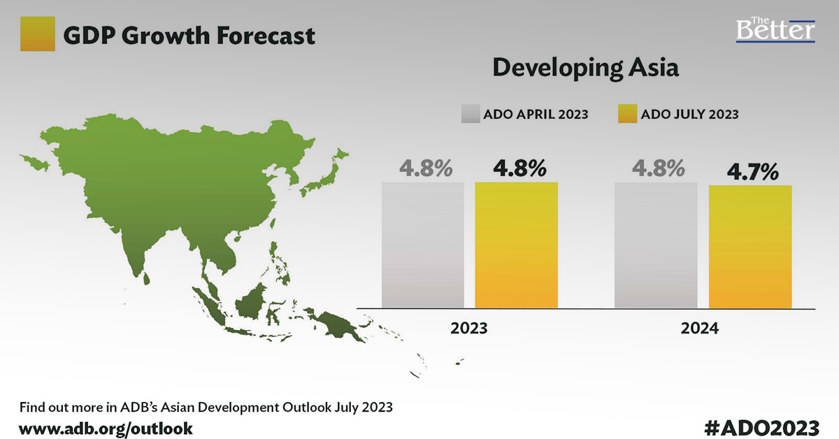 สำหรับการคาดการณ์เศรษฐกิจของประเทศกำลังพัฒนาในเอเชียและแปซิฟิก เอดีบียังคงไว้ในระดับเดิมที่ 4.8% ในปีนี้ เนื่องจากอุปสงค์ในประเทศที่แข็งแกร่งยังคงสนับสนุนการฟื้นตัวของภูมิภาค