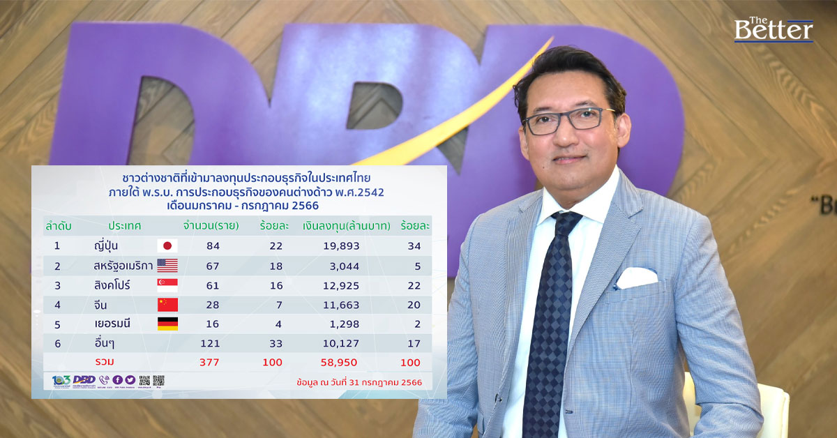 นายทศพล ทังสุบุตร อธิบดีกรมพัฒนาธุรกิจการค้า เปิดเผยว่า ในฐานะเลขานุการคณะกรรมการการประกอบธุรกิจของคนต่างด้าว เปิดเผยว่า “ช่วง 7 เดือนปี 2566 (มกราคม - กรกฎาคม) มีการอนุญาตให้คนต่างชาติเข้ามาลงทุนประกอบธุรกิจในประเทศไทย ภายใต้พระราชบัญญัติการประกอบธุรกิจของคนต่างด้าว พ.ศ. 2542 จำนวน 377 ราย เป็นการลงทุนผ่านช่องทางการขอรับใบอนุญาตประกอบธุรกิจของคนต่างด้าว จำนวน 122 ราย และการขอหนังสือรับรองการประกอบธุรกิจของคนต่างด้าว จำนวน 255 ราย เม็ดเงินลงทุนทั้งสิ้น 58,950 ล้านบาท จ้างงานคนไทย 3,594 คน
