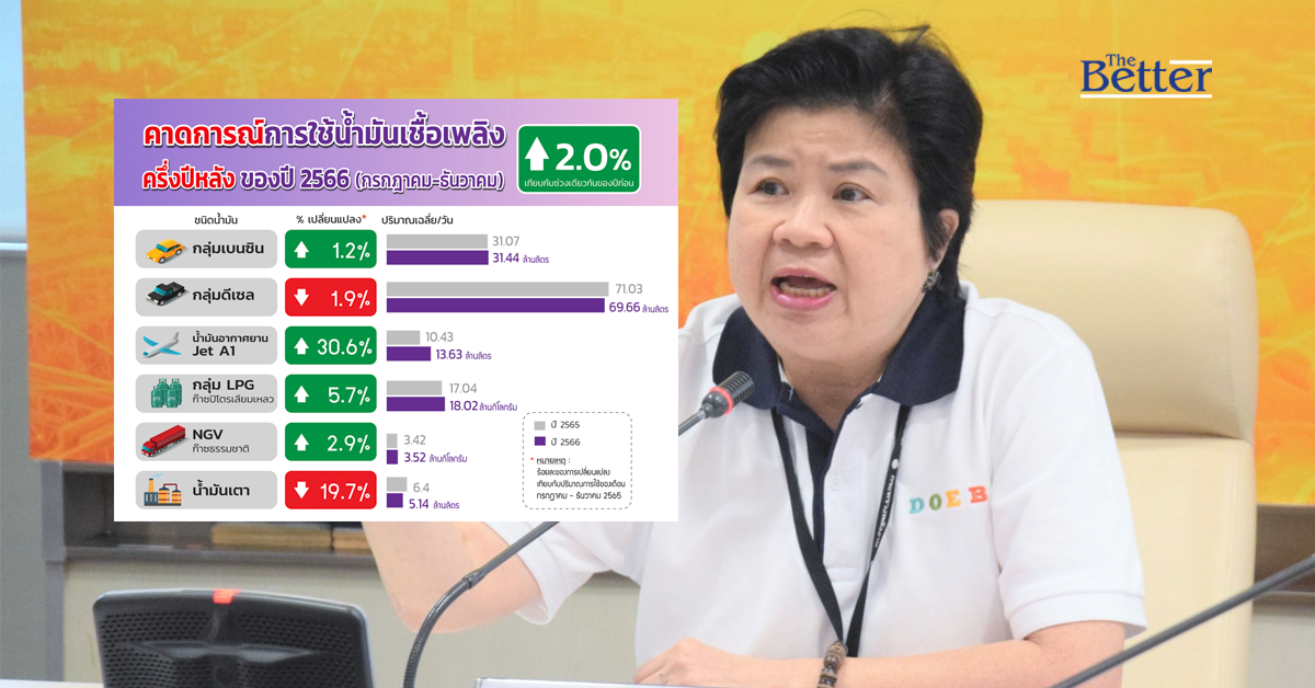 สำหรับภาพรวมการใช้น้ำมันเชื้อเพลิงครึ่งปีแรก ของปี 2566 (เดือนม.ค.- มิ.ย.) เฉลี่ยอยู่ที่ 156.74 ล้านลิตร/วัน เพิ่มขึ้นเมื่อเทียบกับช่วงเดียวกันของปีก่อน 2.7% และคาดภาพรวมทั้งปีการใช้น้ำมันเชื้อเพลิงทุกชนิดมีแนวโน้มปรับตัวเพิ่มขึ้น ส่งสัญญาณการฟื้นตัวของเศรษฐกิจในประเทศ โดยการใช้น้ำมันกลุ่มเบนซิน เฉลี่ยอยู่ที่ 31.96 ล้านลิตร/วัน เพิ่มขึ้นจากช่วงเดียวกันของปีก่อนร้อยละ 5.9 การใช้น้ำมันกลุ่มดีเซล เฉลี่ยอยู่ที่ 72.30 ล้านลิตร/วัน ลดลงจากช่วงเดียวกันของปีก่อนร้อยละ 3.7 เนื่องด้วยปัจจัยด้านราคา