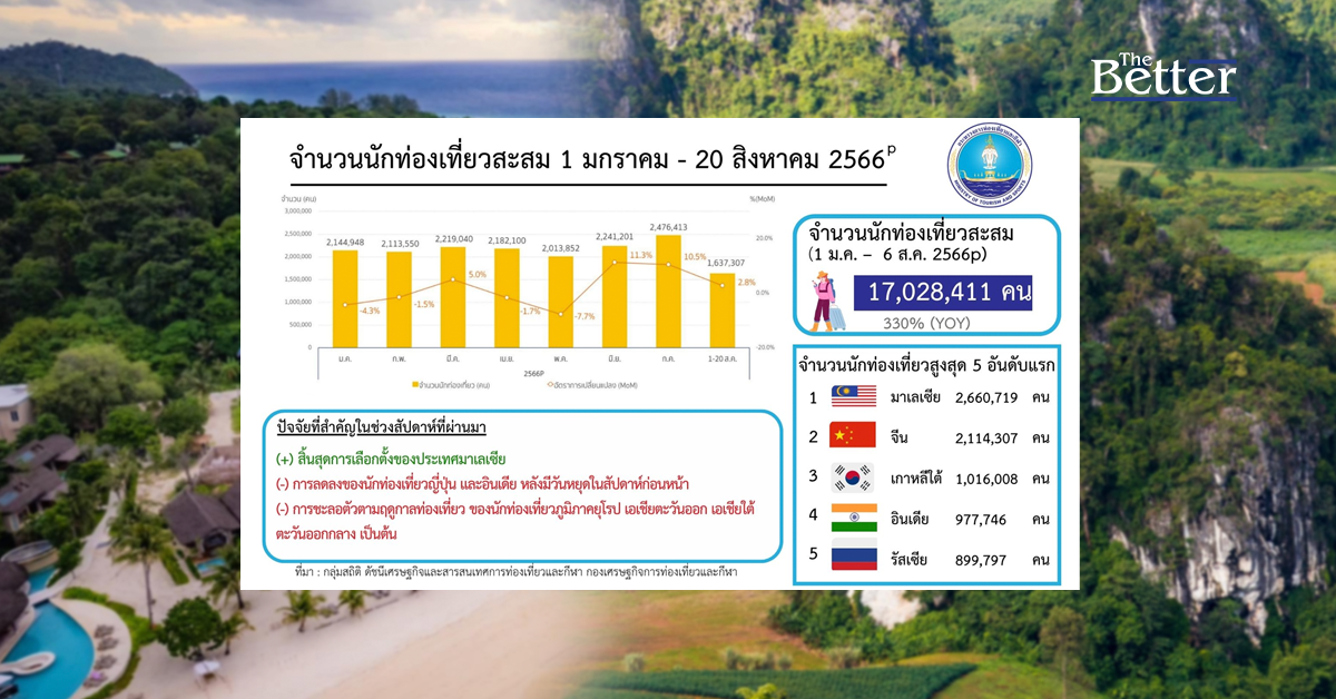 รายงานข่าวจากกองเศรษฐกิจการท่องเที่ยวและกีฬา กระทรวงการท่องเที่ยวและกีฬา ถึงสถานการณ์การท่องเที่ยวว่ามีนักท่องเที่ยวต่างชาติเข้าไทยแล้ว ตั้งแต่วันที่ 1 ม.ค. ถึง 20 ส.ค. 66 มากกว่า 17 ล้านคน ทำให้จำนวนนักท่องเที่ยวสะสมตั้งแต่วันที่ 1 ม.ค. 66 ที่ผ่านมา ทั้งสิ้น 17,028,411 คน สร้างรายได้จากการใช้จ่ายของนักท่องเที่ยวต่างชาติแล้ว 714,421 ล้านบาท