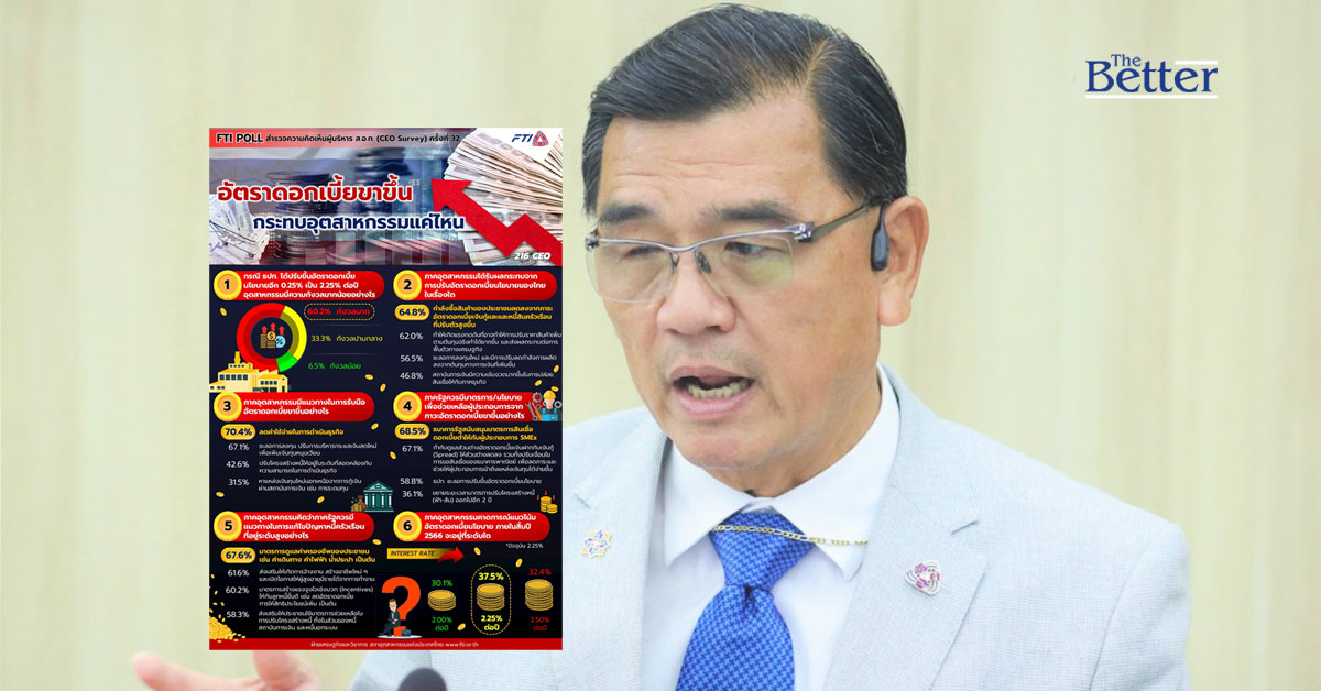 นายมนตรี มหาพฤกษ์พงศ์ รองประธานสภาอุตสาหกรรมแห่งประเทศไทย (ส.อ.ท.) เปิดเผยผลการสำรวจ FTI Poll ครั้งที่ 32 ในเดือนสิงหาคม 2566 ภายใต้หัวข้อ “อัตราดอกเบี้ยขาขึ้น กระทบอุตสาหกรรมแค่ไหน” ผู้บริหาร ส.อ.ท. มองว่า สืบเนื่องจากคณะกรรมการนโยบายการเงิน (กนง.) เมื่อวันที่ 2 สิงหาคม 2566 มีมติปรับขึ้นอัตราดอกเบี้ยนโยบาย 0.25% ต่อปี จาก 2.00% เป็น 2.25% สูงสุดในรอบ 9 ปี ซึ่งส่งผลทำให้ต้นทุนทางการเงินปรับตัวเพิ่มสูงขึ้นต่อเนื่อง