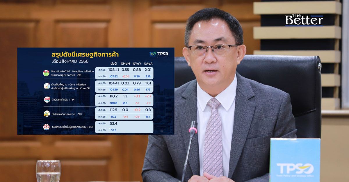 นายพูนพงษ์ นัยนาภากรณ์ ผู้อำนวยการสำนักงานนโยบายและยุทธศาสตร์การค้า เผยว่า ดัชนีราคาผู้บริโภคของไทย เดือนสิงหาคม 2566 เท่ากับ 108.41 เมื่อเทียบกับเดือนสิงหาคม 2565 ซึ่งเท่ากับ 107.46 ส่งผลให้อัตราเงินเฟ้อทั่วไปสูงขึ้นร้อยละ 0.88 (YoY) เพิ่มขึ้นเล็กน้อยจากร้อยละ 0.38 ในเดือนกรกฎาคม 2566 ตามการสูงขึ้นของสินค้า ในกลุ่มพลังงานเป็นสำคัญ ขณะที่กลุ่มอาหารสดราคาทรงตัว ส่วนเนื้อสัตว์ และเครื่องประกอบอาหารราคาลดลงส่งผลให้สินค้าในหมวดอาหารและเครื่องดื่มไม่มีแอลกอฮอล์ราคาโดยรวมชะลอตัวต่อเนื่อง