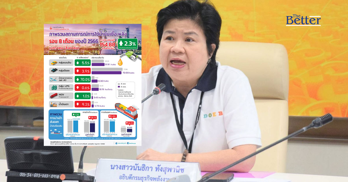 น.ส.นันธิกา ทังสุพานิช อธิบดีกรมธุรกิจพลังงาน เผยภาพรวมการใช้น้ำมันเชื้อเพลิงเฉลี่ยเดือนมกราคม – สิงหาคม 2566 อยู่ที่ 154.88 ล้านลิตร/วัน เพิ่มขึ้นเมื่อเทียบกับช่วงเดียวกันของปีก่อนร้อยละ 2.3 โดยการใช้น้ำมันกลุ่มเบนซินเพิ่มขึ้นร้อยละ 5.5 น้ำมันอากาศยานเชิงพาณิชย์ (Jet A1) เพิ่มขึ้นร้อยละ 70.0 และการใช้ NGV เพิ่มขึ้นร้อยละ 1.0