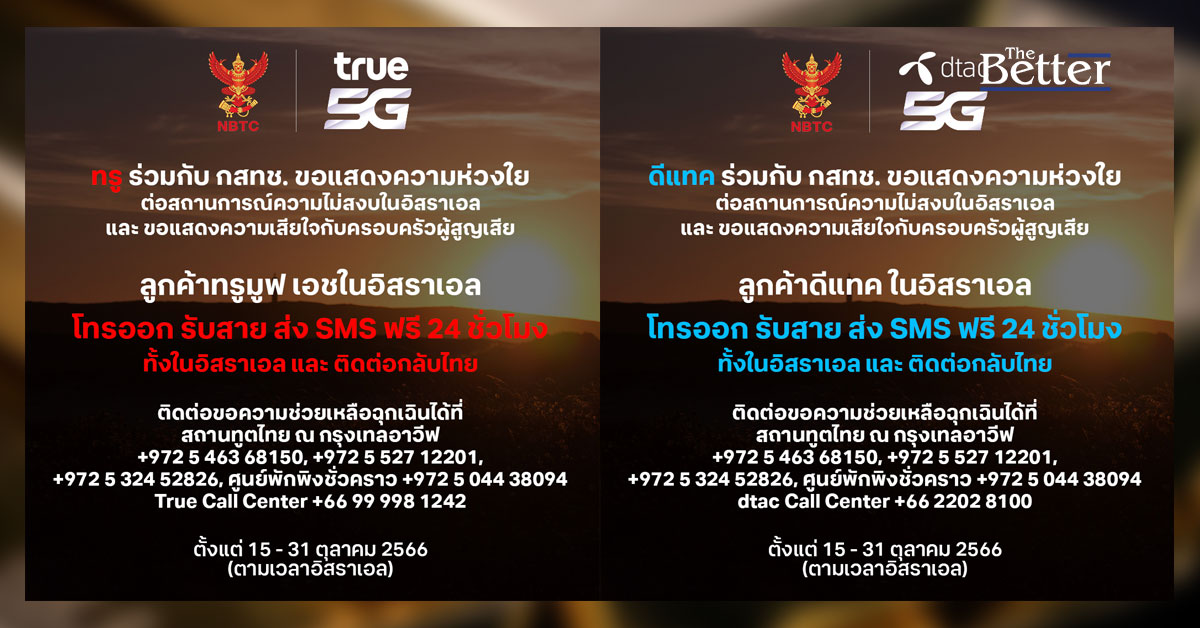 เพิ่มเติมจากมาตรการเร่งด่วนขั้นต้นที่อำนวยความสะดวกให้ลูกค้าทรูมูฟ เอช และดีแทคที่ใช้บริการโรมมิ่งอยู่ในอิสราเอล สามารถโทรติดต่อและขอความช่วยเหลือฉุกเฉินจากสถานทูตไทย ณ กรุงเทลอาวีฟ และ Call Center ทั้งทรูและดีแทคได้ฟรี มาตั้งแต่ 7 ตุลาคมที่ผ่านมา