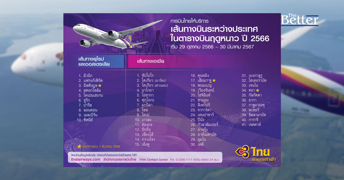 การบินไทยทำการบินสู่ 51 เส้นทางบิน ในตารางบินฤดูหนาว ปี 2566 พร้อมเพิ่มความถี่เที่ยวบินในเส้นทางยอดนิยม ยุโรป -เอเชีย