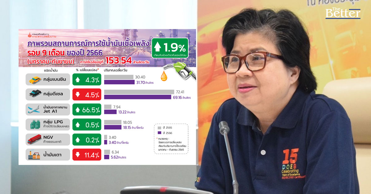 สำหรับภาพรวมการใช้น้ำมันเชื้อเพลิงในช่วง 9 เดือน ตั้งแต่มกราคม - กันยายน 2566 อยู่ที่ 153.34 ล้านลิตรต่อวัน เพิ่มขึ้นเมื่อเทียบกับช่วงเดียวกันของปีก่อนเพิ่มขึ้น4.3% โดยเป็นการใช้น้ำมันกลุ่มเบนซินเพิ่มขึ้น 4.3% อยู่ที่ 31.70 ล้านลิตร/วัน น้ำมันอากาศยานเชิงพาณิชย์อยู่ที่ 13.44 ล้านลิตร/วัน เพิ่มขึ้น 66.5 % การใช้ LPG อยู่ที่ 33.61 ล้านลิตร/วัน เพิ่มขึ้น 0.5% ก๊าซธรรมชาติสำหรับยานยนต์(NGV )อยู่ที่ 3.40 ล้านกก./วันเพิ่มขึ้น 0.2% กลุ่มดีเซลอยู่ที่ 69.16 ล้านลิตร/วันลดลง 4.5% จากฐานการผลิตปีก่อนที่สูงผิดปกติประกอบกับเศรษฐกิจชะลอตัวบางส่วน น้ำมันเตาอยู่ที่ 5.62 ล้านลิตร/วันลดลง 11.4% จากผลกระทบภาคการผลิตที่ลดลงจากการส่งออกที่ชะลอ