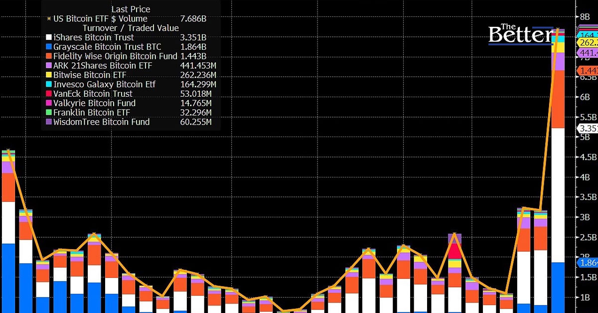 รายงานจาก Cointelegraph ระบุว่าปริมาณซื้อขายกองทุน Spot Bitcoin ETF ในสหรัฐฯ ได้ทำลายสถิติใหม่ โดยมียอดซื้อขายสูงถึง 7.69 พันล้านดอลลาร์สหรัฐฯ เมื่อวันที่ 29 กุมภาพันธ์ พ.ศ. 2567 จากสถิติเดิมที่ 4.66 พันล้านดอลลาร์เมื่อวันที่ 11 มกราคม พ.ศ. 2567 นำโดยกองทุน iShares Bitcoin ETF ของ BlackRock ที่มียอดซื้อขายสูงถึง 3.35 พันล้านดอลลาร์ ตามมาโดย Grayscale Bitcoin Trust ที่ 1.86 พันล้านดอลลาร์ และ Fidelity Wise Origin Bitcoin Fund ที่ 1.44 พันล้านดอลลาร์