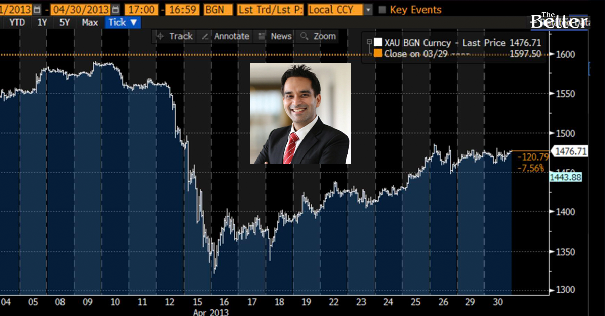 “ทองคำยังอาจเป็นขาขึ้นจากการสะสมทองของธนาคารกลางทั่วโลก ความเสี่ยงด้านภูมิรัฐศาสตร์ และการลดดอกเบี้ยของสหรัฐในอนาคต วันนี้เห็นราคาทองทะลุสี่หมื่นบาทก็น่ายินดีครับ แต่สำหรับคนเก็งกำไรระยะสั้น ผมอยากเตือนว่าในปี 2013 ช่วงวันหยุดสงกรานต์ของไทย ราคาทองคำตลาดโลกดิ่งลงแรง (ตามรูป) แม้จะไต่ราคาขึ้นมาบ้างแต่ก็เต็มไปด้วยความไม่แน่นอน (ปีนั้นราคาทองลงต่อยาว)
