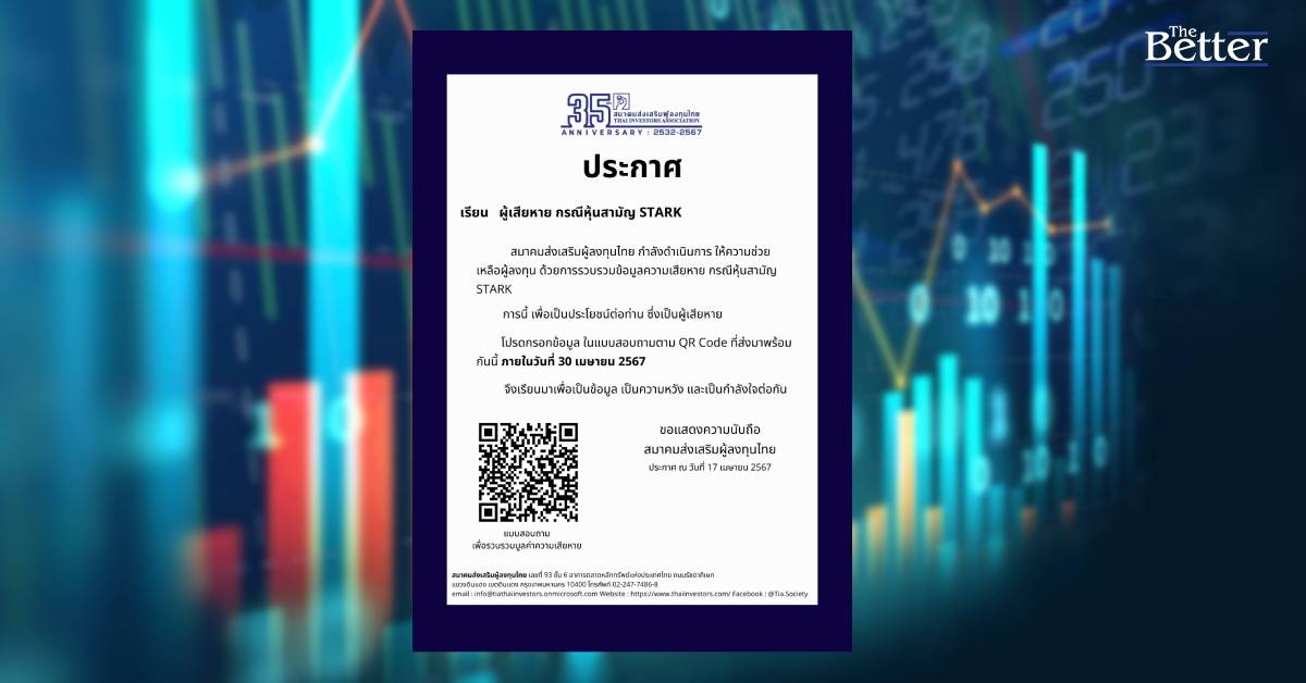 สมาคมส่งเสริมผู้ลงทุนไทย เปิดให้ผู้เสียหายจากหุ้น STARK เร่งดำเนินการส่งข้อมูลภายในวันที่ 30 เมษายน 2567 เพื่อดำเนินการช่วยเหลือในการฟ้องแบบกลุ่ม หรือ Class Action