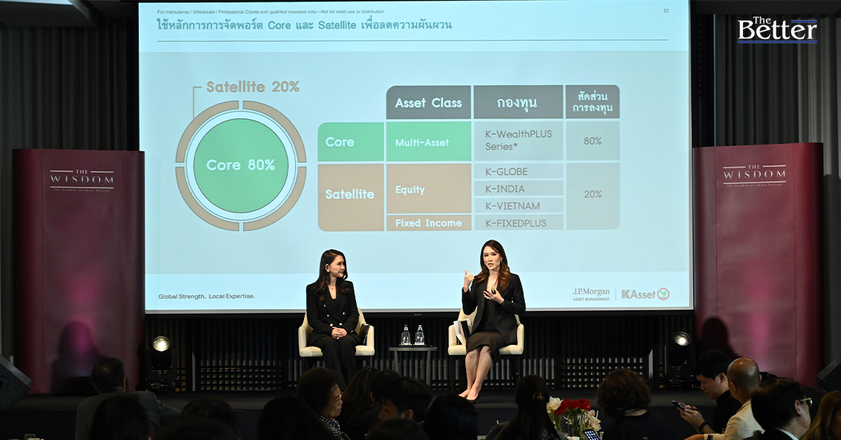 ในการกำหนดกลยุทธ์การลงทุน นางสาวมทินา แนะนำการจัดพอร์ตแบบ Core & Satellite Portfolio เป็นการกระจายความเสี่ยง โดยลงทุนในกองทุน ‘K-WealthPLUS Series’ ที่กระจายการลงทุนในสินทรัพย์หลายประเภททั่วโลก เป็นโซลูชันด้านการลงทุนที่ บลจ. กสิกรไทยพัฒนาร่วมกับ J.P. Morgan Asset Management พันธมิตรด้านการลงทุนระดับโลก แนะนำให้ถือเป็น Core Port ในสัดส่วน 80% ของพอร์ตทั้งหมด สามารถเลือกได้ตามระดับความเสี่ยงที่เหมาะสม ได้แก่