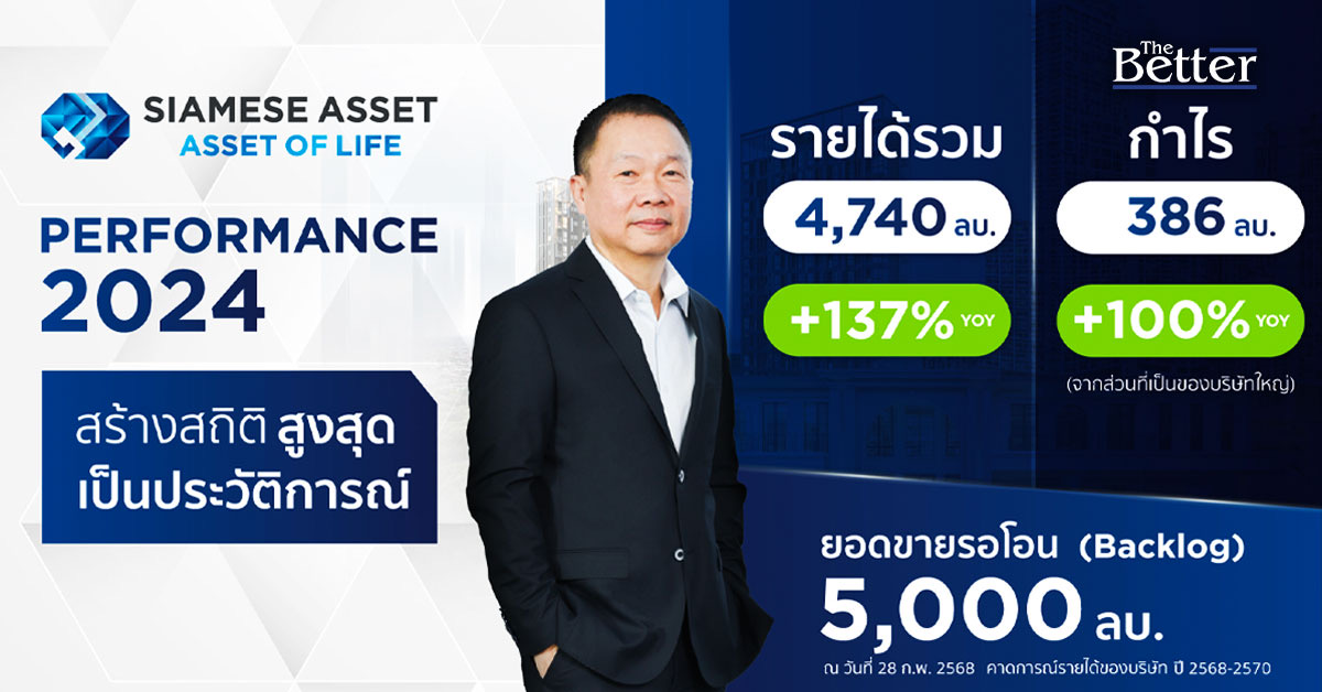 บริษัท ไซมิส แอสเสท จำกัด (มหาชน) หรือ SA ผู้นำด้านการพัฒนาอสังหาริมทรัพย์ ประกาศผลการดำเนินงานของกลุ่มบริษัทฯ ในปี 2567 มีรายได้รวม 4,740.05 ล้านบาท เพิ่มขึ้น 2,744.74 ล้านบาท หรือเพิ่มขึ้น 137.56% เทียบปีก่อน มีกำไรสุทธิเท่ากับ 386.32 ล้านบาท เพิ่มขึ้น 100.11% ซึ่งเป็นผลมาจากยอดโอนโครงการ LANDMARK AT MRTA STATION เป็นตัวขับเคลื่อนหลัก รวมไปถึงธุรกิจโรงแรม-บริการ ร้านอาหาร มีส่วนช่วยผลักดันรายได้ให้เพิ่มขึ้น