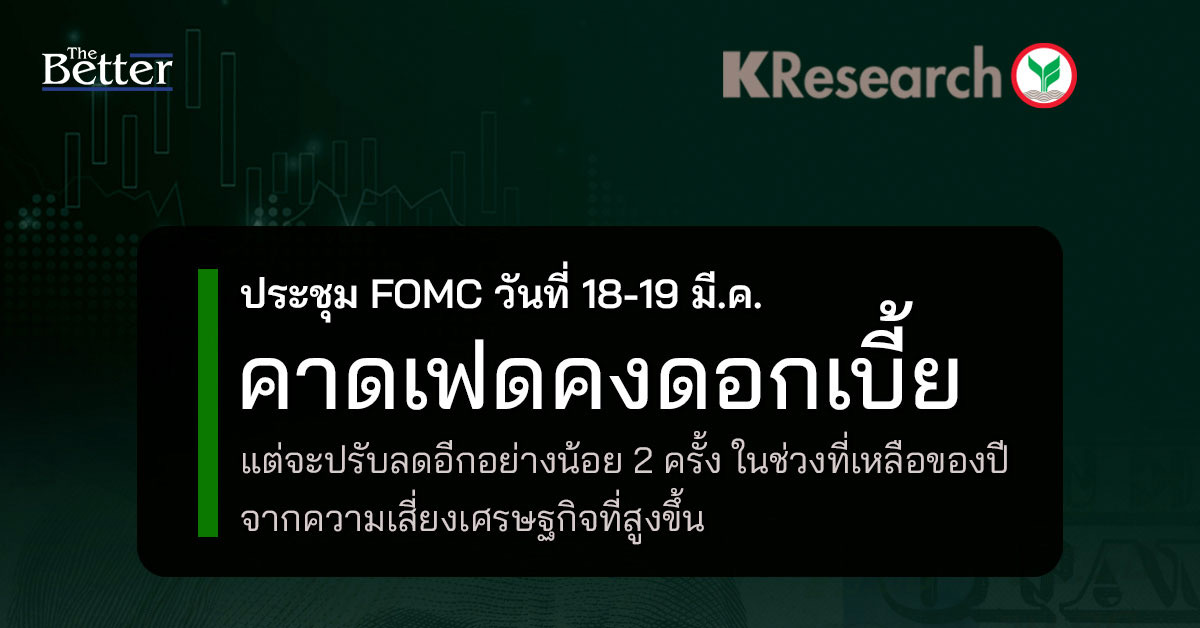 ศูนย์วิจัยกสิกรไทยมองว่า เฟดจะปรับลดดอกเบี้ยอีกอย่างน้อย 2 ครั้งในปีนี้ โดยจังหวะการปรับลดคงขึ้นอยู่กับข้อมูลเศรษฐกิจสำคัญที่ออกมา ประกอบกับอาจมีการส่งสัญญาณชะลอการท า Quantitative Tightening (QT) ลง สอดคล้องกับตลาดส่วนใหญ่ที่ปรับมุมมองต่อการปรับลดดอกเบี้ยของเฟดมากขึ้นมาอยู่ที่ 3 ครั้งในปีนี้ ทั้งนี้ ในการประชุมรอบนี้จะมีการเผยแพร่ประมาณการเศรษฐกิจ เงินเฟ้อ และ Dot Plot ซึ่งเป็นปัจจัยที่ตลาดรอติดตาม