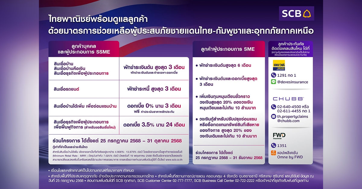 จากสถานการณ์ ความขัดแย้งระหว่างไทยและกัมพูชาและสถานการณ์อุทกภัยฉับพลันจากอิทธิพลของพายุ “วิภา” ที่เกิดขึ้น ซึ่งส่งผลกระทบอย่างรุนแรงต่อทรัพย์สินและความเป็นอยู่ของประชาชนในหลายพื้นที่ทั่วประเทศ ธนาคารไทยพาณิชย์ตระหนักถึงความเดือดร้อนของลูกค้า และพร้อมอยู่เคียงข้างเพื่อให้ความช่วยเหลืออย่างเต็มกำลัง ผ่านมาตรการเร่งด่วนที่ครอบคลุม ทั้งลูกค้าบุคคล ลูกค้าสินเชื่อธุรกิจเพื่อผู้ประกอบการและลูกค้าผู้ประกอบการ SME โดยให้ความช่วยเหลือสำหรับลูกค้าปัจจุบันและลูกค้าใหม่ ทั้งในรูปแบบการพักชำระหนี้ และการสนับสนุนสินเชื่อใหม่เพื่อซ่อมแซมที่อยู่อาศัย รวมถึงฟื้นฟูกิจการที่ได้รับผลกระทบ โดยมีรายละเอียดดังนี้