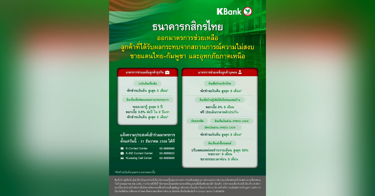 นายรุ่งเรือง สุขเกิดกิจพิบูลย์ ผู้จัดการใหญ่ ธนาคารกสิกรไทย เปิดเผยว่า จากสถานการณ์ความไม่สงบที่ชายแดนไทย-กัมพูชา และสถานการณ์อุทกภัยในภาคเหนือที่เกิดขึ้นจากอิทธิพลของพายุ “วิภา” ได้ส่งผลกระทบต่อทรัพย์สินและความเป็นอยู่ของประชาชนในหลายพื้นที่ ธนาคารกสิกรไทยตระหนักดีถึงความเดือดร้อนของลูกค้าที่ได้รับผลกระทบโดยตรง จึงรีบดำเนินการเร่งด่วนออกมาตรการช่วยเหลือลูกค้าทั้งลูกค้าบุคคลและลูกค้าธุรกิจ เพื่อช่วยแบ่งเบาภาระและช่วยให้ลูกค้าสามารถพลิกฟื้นกลับสู่สถานการณ์ปกติได้ในเร็ววัน โดยมีรายละเอียดมาตรการช่วยเหลือ ดังนี้