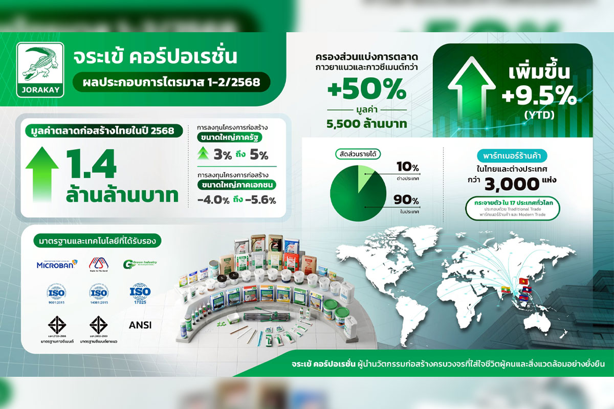 “จระเข้ คอร์ปอเรชั่น” โชว์ผลงานครึ่งแรกปี 68 โตแกร่ง 9.5% กางโรดแมปสู้ศึกเศรษฐกิจไทย รักษาเบอร์หนึ่งมาร์เก็ตแชร์ตลาดกาวซีเมนต์และกาวยาแนว พร้อมลุยตลาดต่างประเทศเต็มสูบ รับมือชายแดนไทย-กัมพูชา