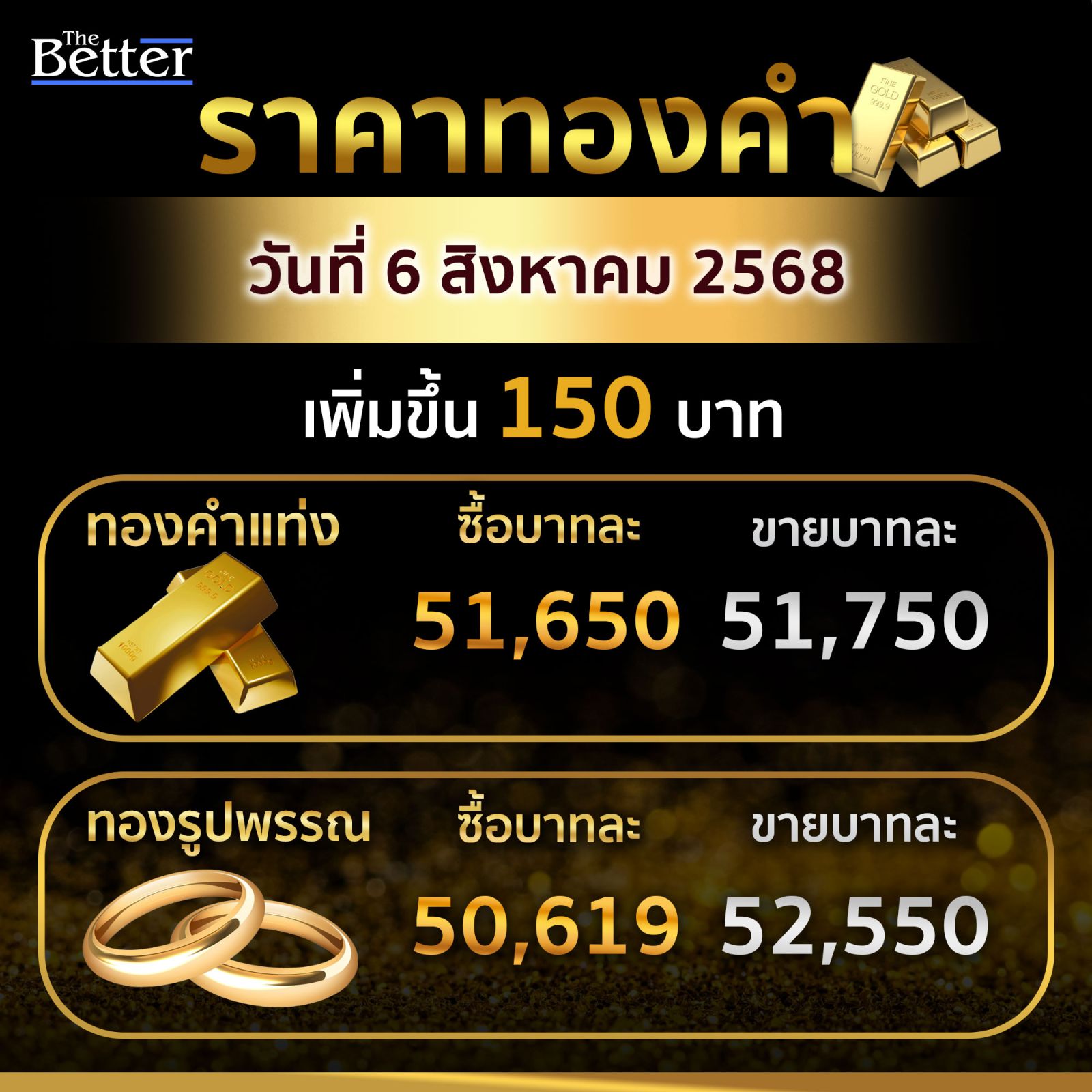 สมาคมค้าทองคำ เผย ราคาทองวันนี้ 6 ส.ค.68 เปิดตลาดขึ้น 150 บาท ทองแท่งขายออก 51,750 รูปพรรณ 52,550 บาท